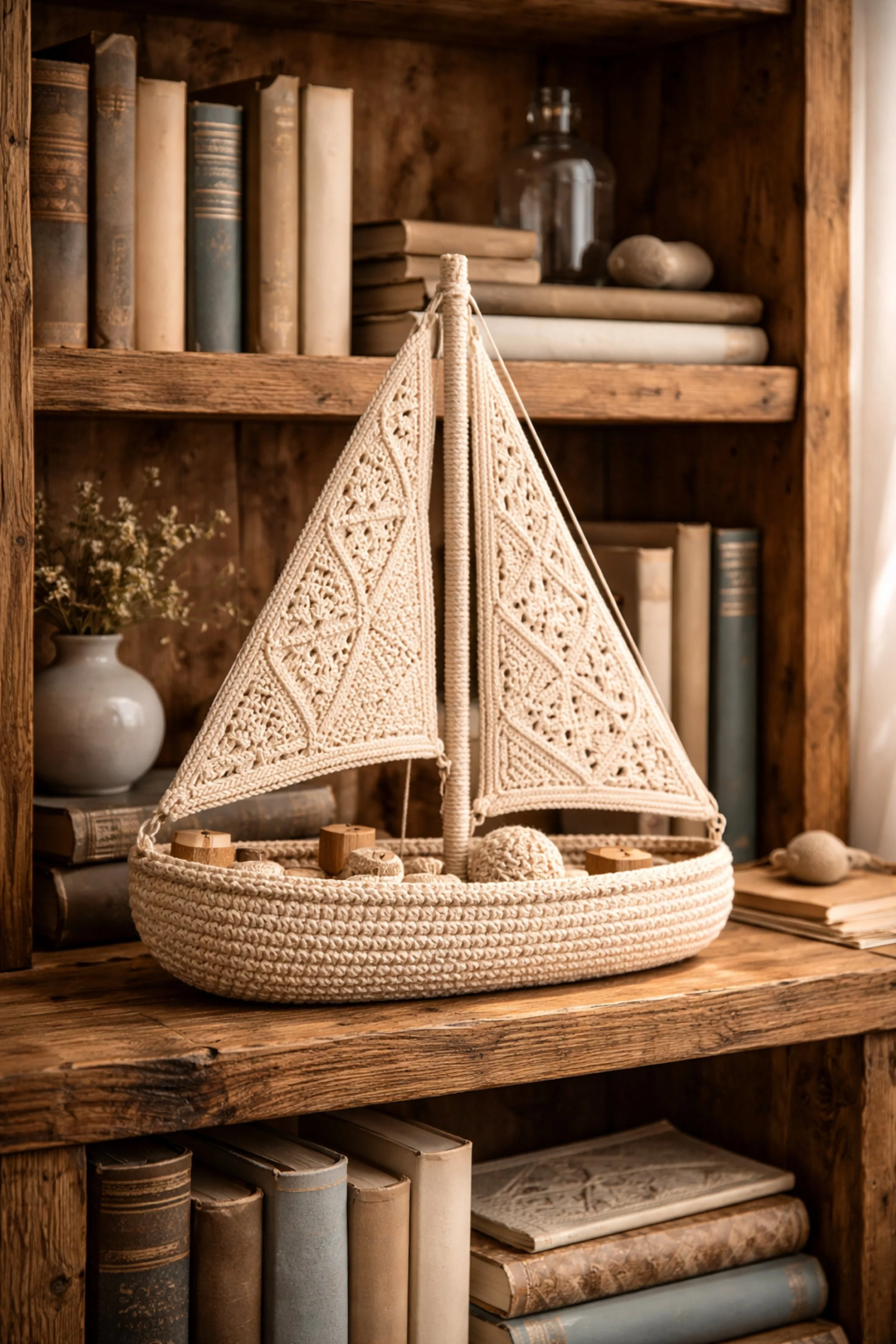 You’re making a richly textured crochet sailboat styled for a darker, old world shelf. This version has an oval rope like hull, two grand lace sails, and a deeper, warmer visual mood that works beautifully with antique books, weathered wood, and aged glass. The construction is similar to the first design, but the styling and finishing choices make it feel more substantial and storied.
