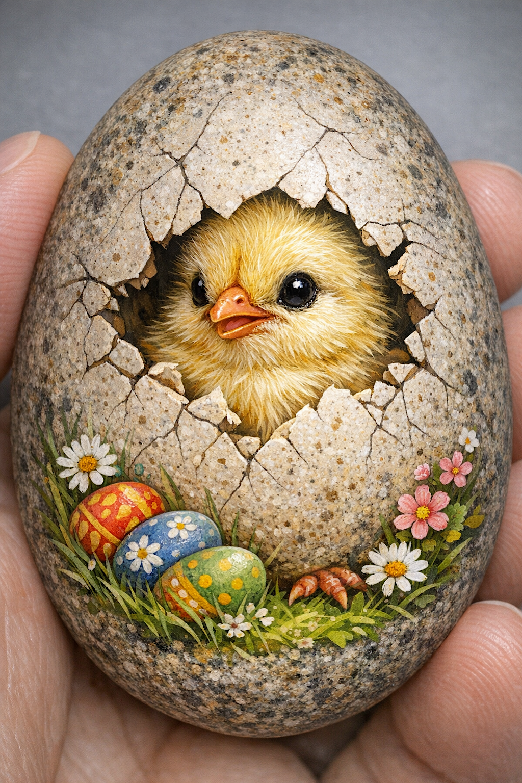 You’re painting an Easter egg shaped stone so it looks like a tiny chick is hatching right out of the rock. The finished piece has a realistic cracked shell opening, soft yellow fluff, glossy black eyes, a tiny orange beak, spring grass, daisies, and a cluster of decorated Easter eggs near the base. It is the kind of project that feels impressively detailed when finished, but it is absolutely possible to build in layers if you work patiently and let each section dry.