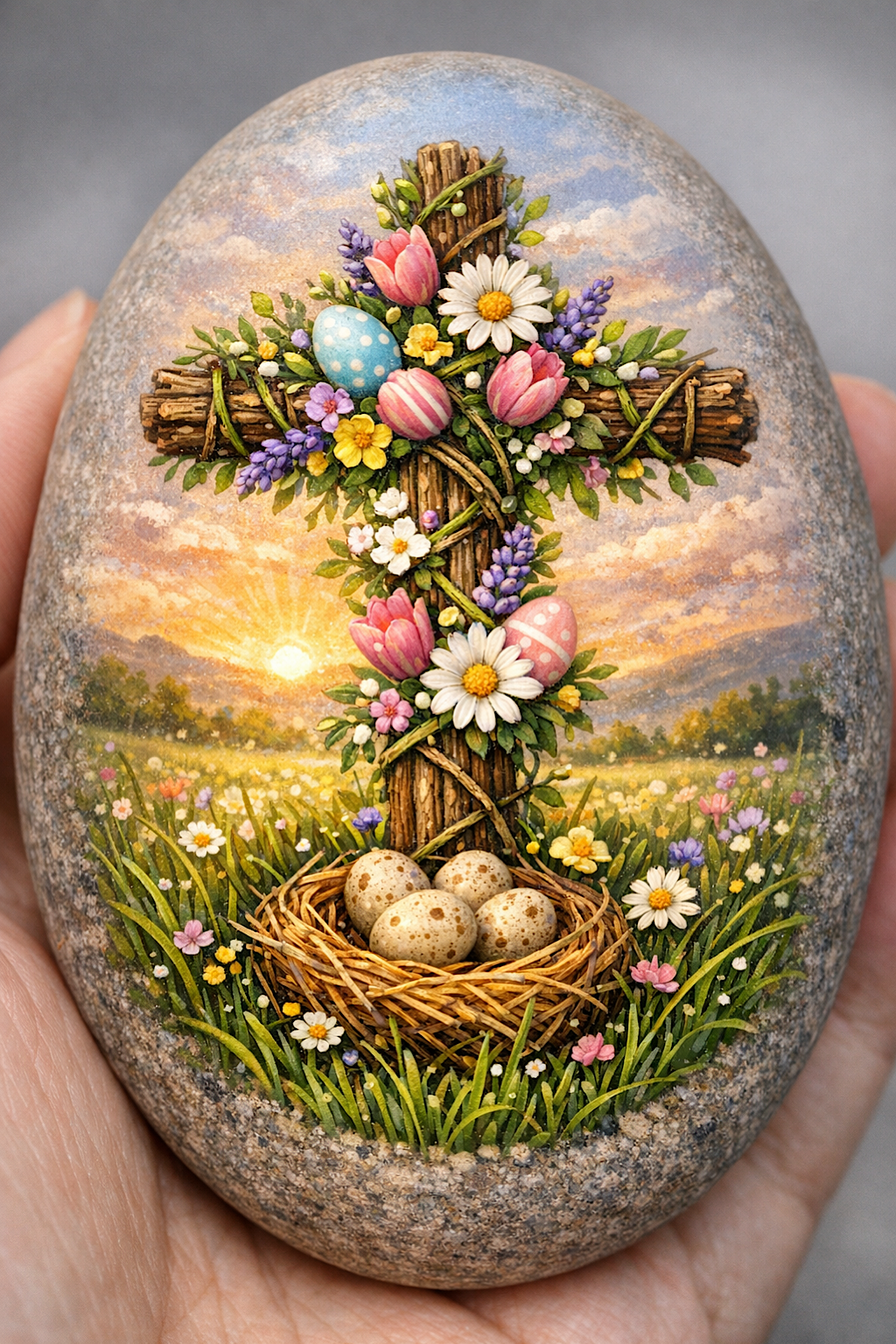 This design looks especially lovely in soft natural light because the sky colors and floral details become more dimensional. For display, prop it on a small easel or place it among faux moss and a few quail style speckled eggs to echo the nest. If you are making several symbolic Easter stones, this one pairs beautifully with a chick, bunny, and fairy door design.