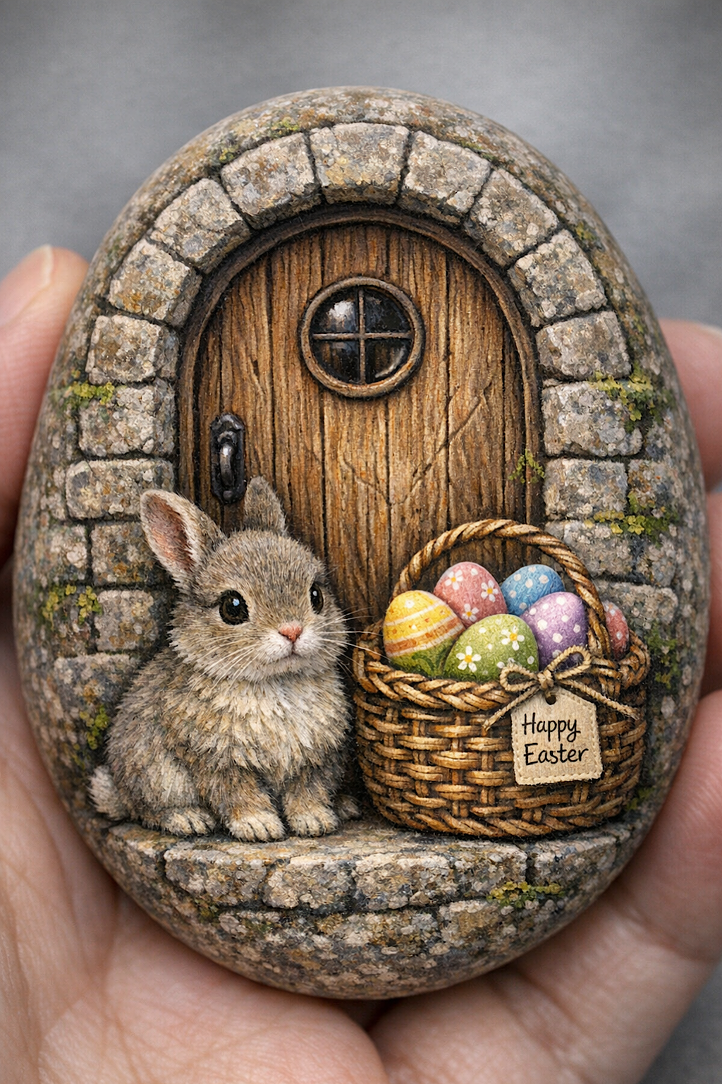 You’re creating a storybook style painted rock that looks like a tiny bunny sitting outside a rustic cottage door with a basket of pastel Easter eggs. The finished design has a stone arch, weathered wood door, soft gray bunny fur, a woven basket, and a warm woodland feel that makes the rock look like a miniature enchanted doorway.