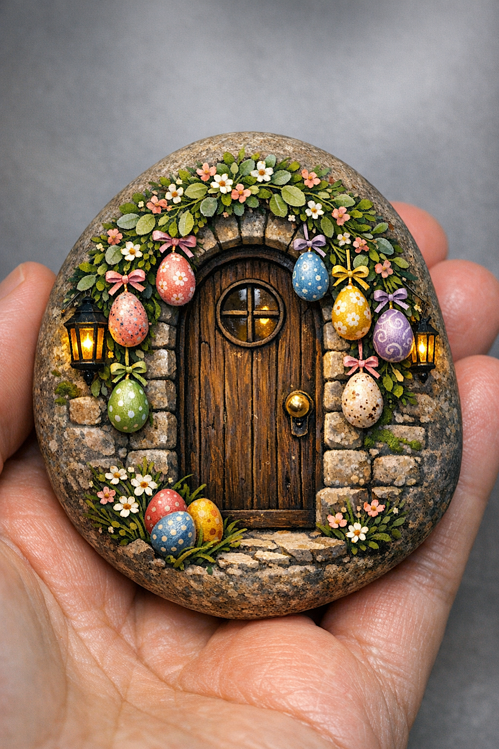 This project creates a charming fairy style Easter doorway painted directly onto an egg shaped stone. The design includes a rustic wooden door set into a stone arch, glowing lanterns, floral garland, pastel hanging eggs, tiny blooms, and a welcoming springtime cottage mood. It feels like a little hidden Easter home tucked inside the rock.
