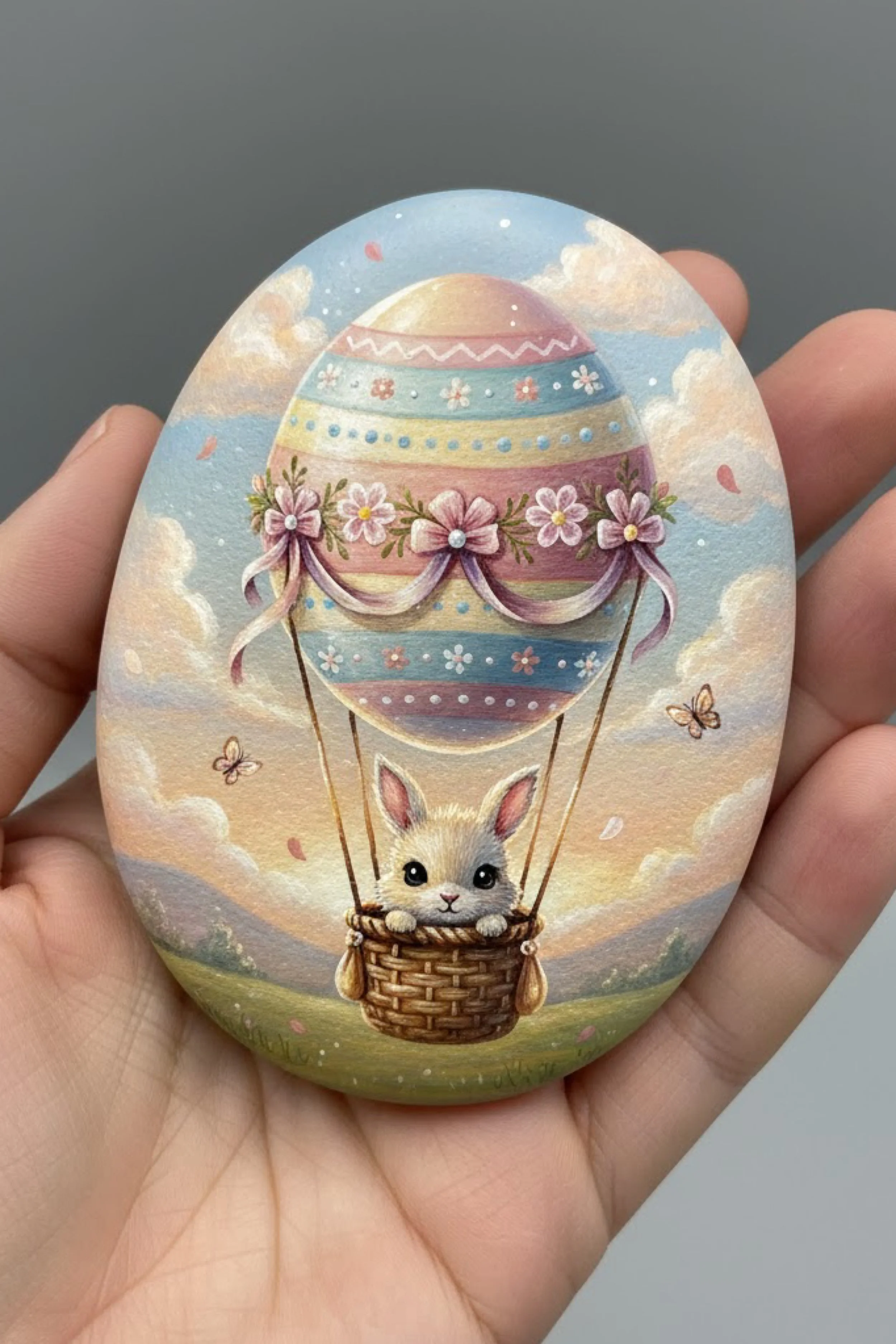 This painted rock design features a tiny bunny riding in a basket suspended beneath a pastel Easter egg hot air balloon. It has a dreamy sky, soft clouds, delicate ribbon garlands, little blossoms, and an airy spring palette that feels whimsical and gentle. The result looks like a tiny storybook illustration wrapped onto a stone.