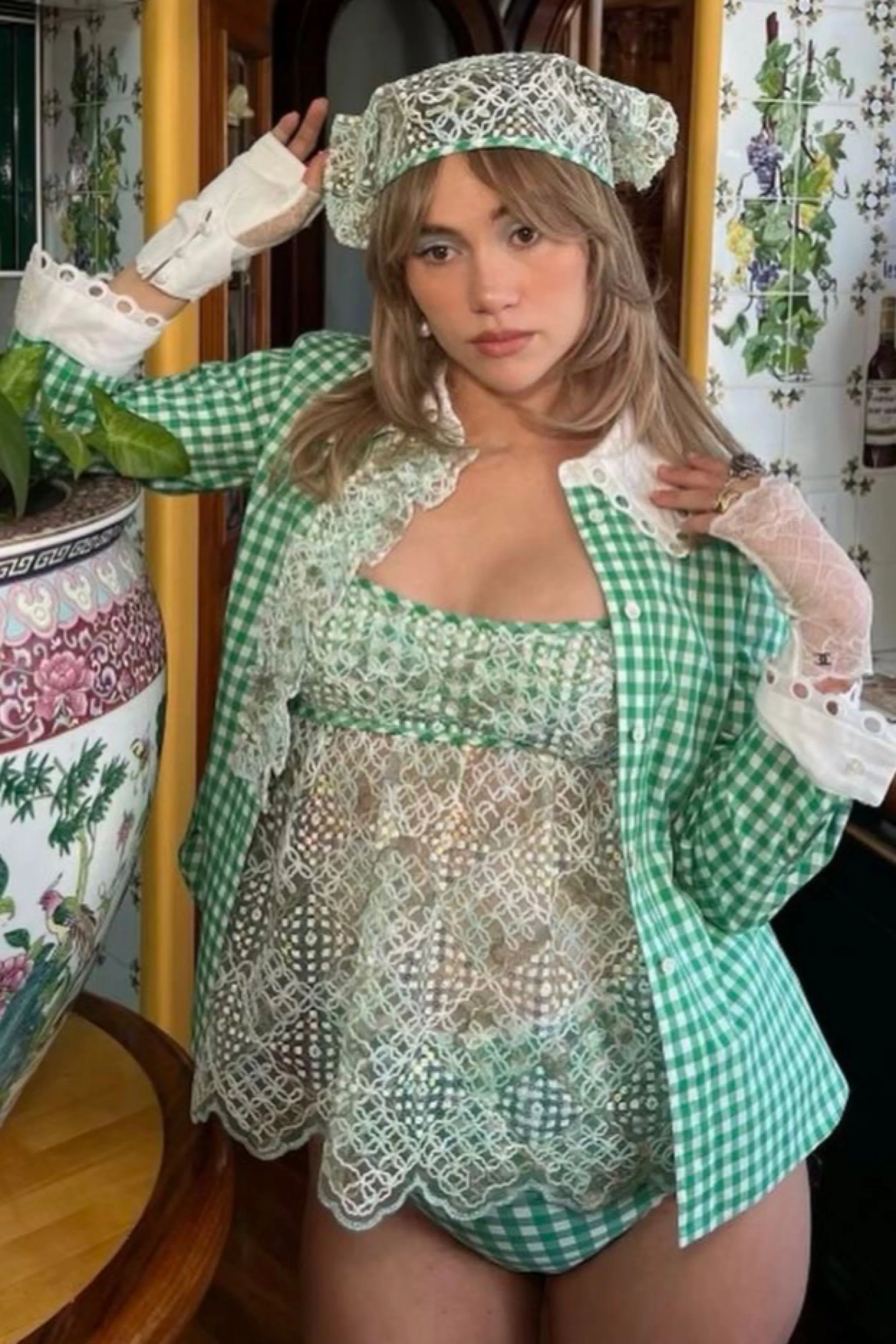 A pastoral fantasy wrapped in lace and gingham. This outfit pairs a green check blouse with matching high-waisted bottoms and a sheer embroidered overlay that softens the rustic print into something utterly romantic. The lace bonnet and fingerless gloves give the look an old-world sweetness, like a countryside dream reimagined through a cottage-core lens. It feels both vintage and futuristic—an echo of picnic pasts layered with delicate transparency and modern femininity.