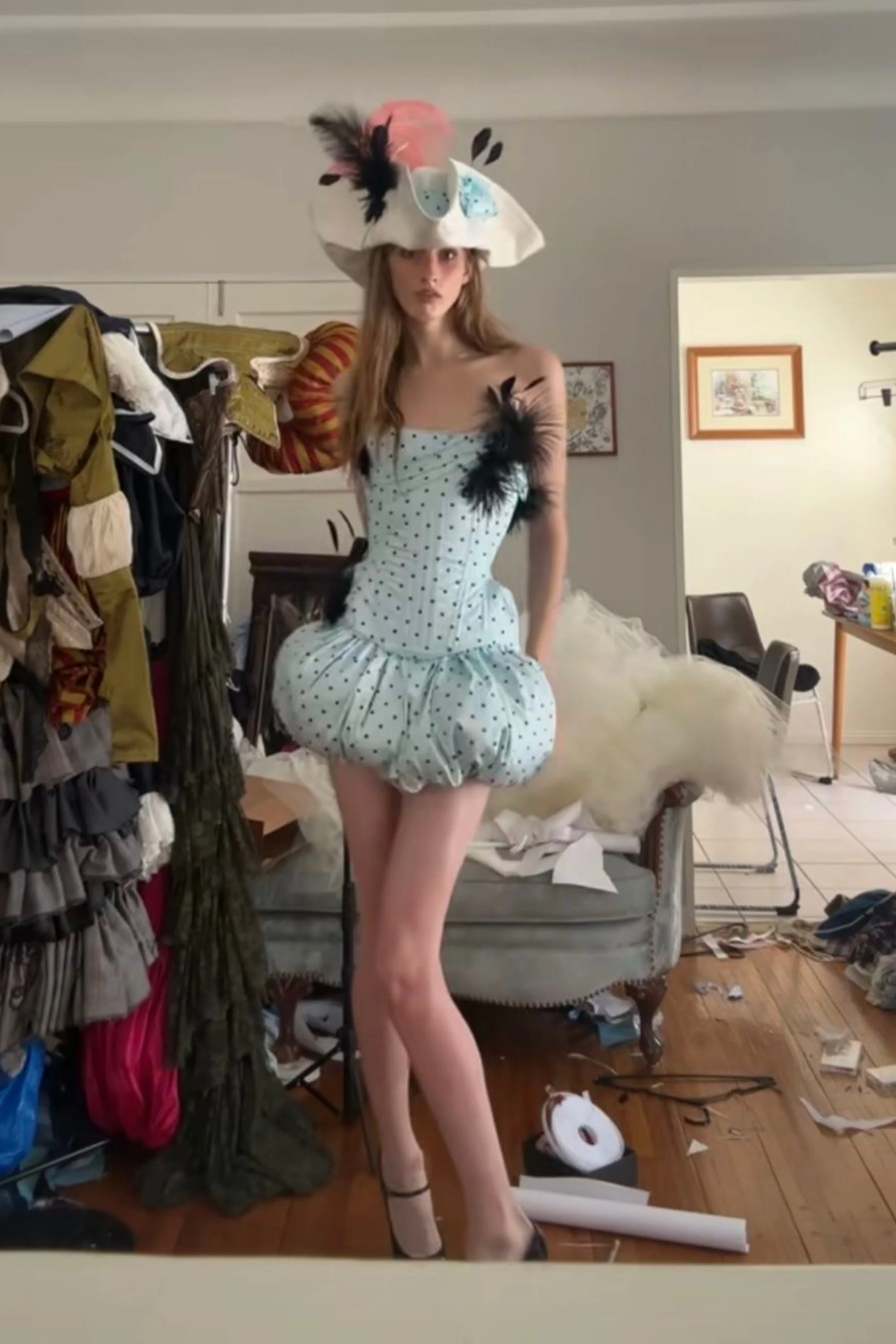 A pale blue corset dress dusted with black polka dots and adorned with soft black feathers transforms the wearer into a living porcelain doll. Its ballooned skirt exaggerates the hips while the strapless bodice sculpts the figure in a flirtatious display of proportion and play. The oversized hat, layered with contrasting black and pink plumes, feels lifted from a surreal carnival—part Marie Antoinette, part modern fantasy. The texture of satin and feather brings an eccentric softness that turns this look into something rare and theatrical, meant for anyone unafraid to dress like a piece of art.