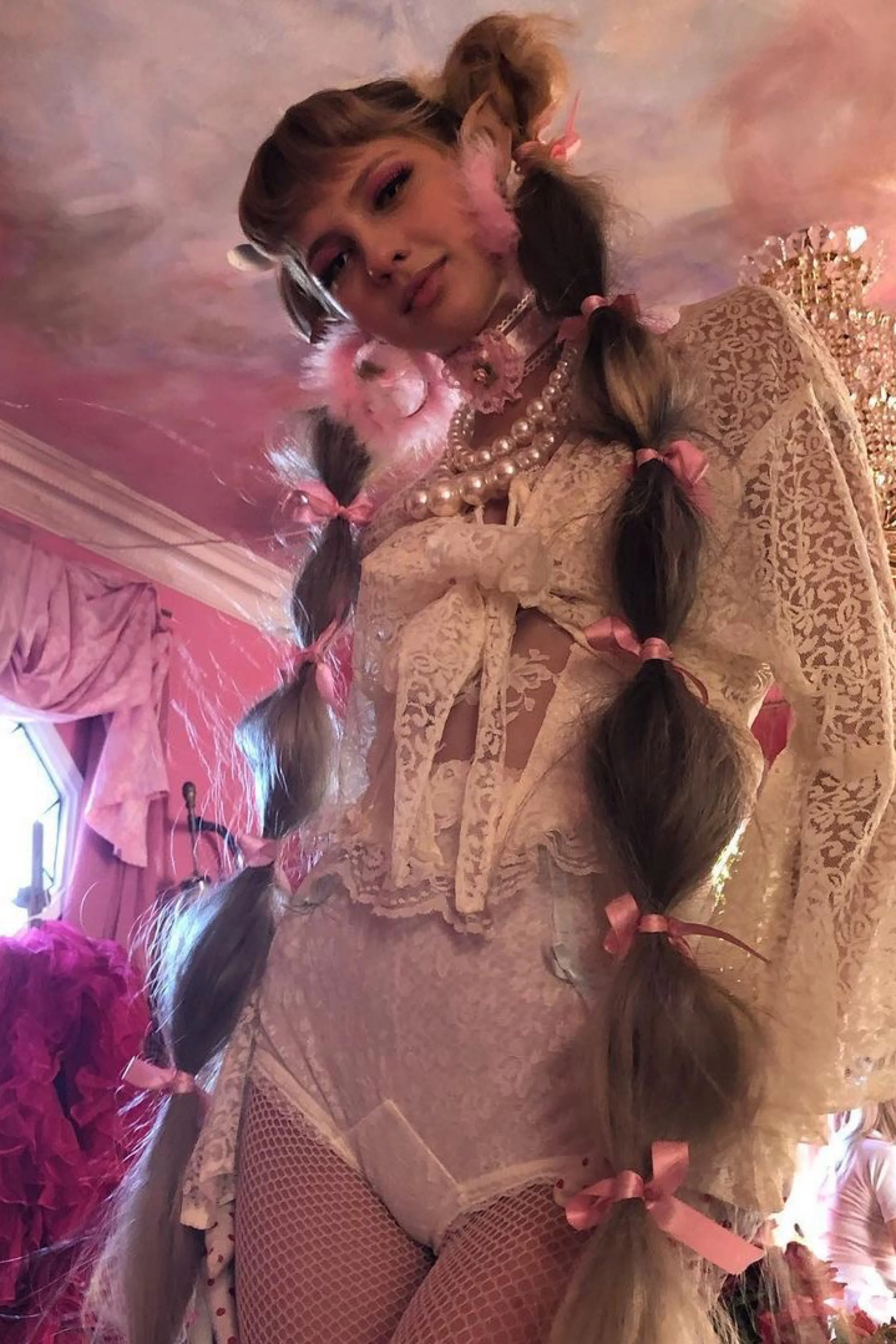 This outfit looks like it was spun out of sugar and lace. Layers of ivory fabric wrap around the body, tied together with soft pink ribbons that adorn the hair and neck. The abundance of pearls, lace sleeves, and frills channel Victorian decadence through a modern, almost fantastical lens. It’s an ensemble that feels alive in motion—feminine, eccentric, and steeped in fairytale excess.