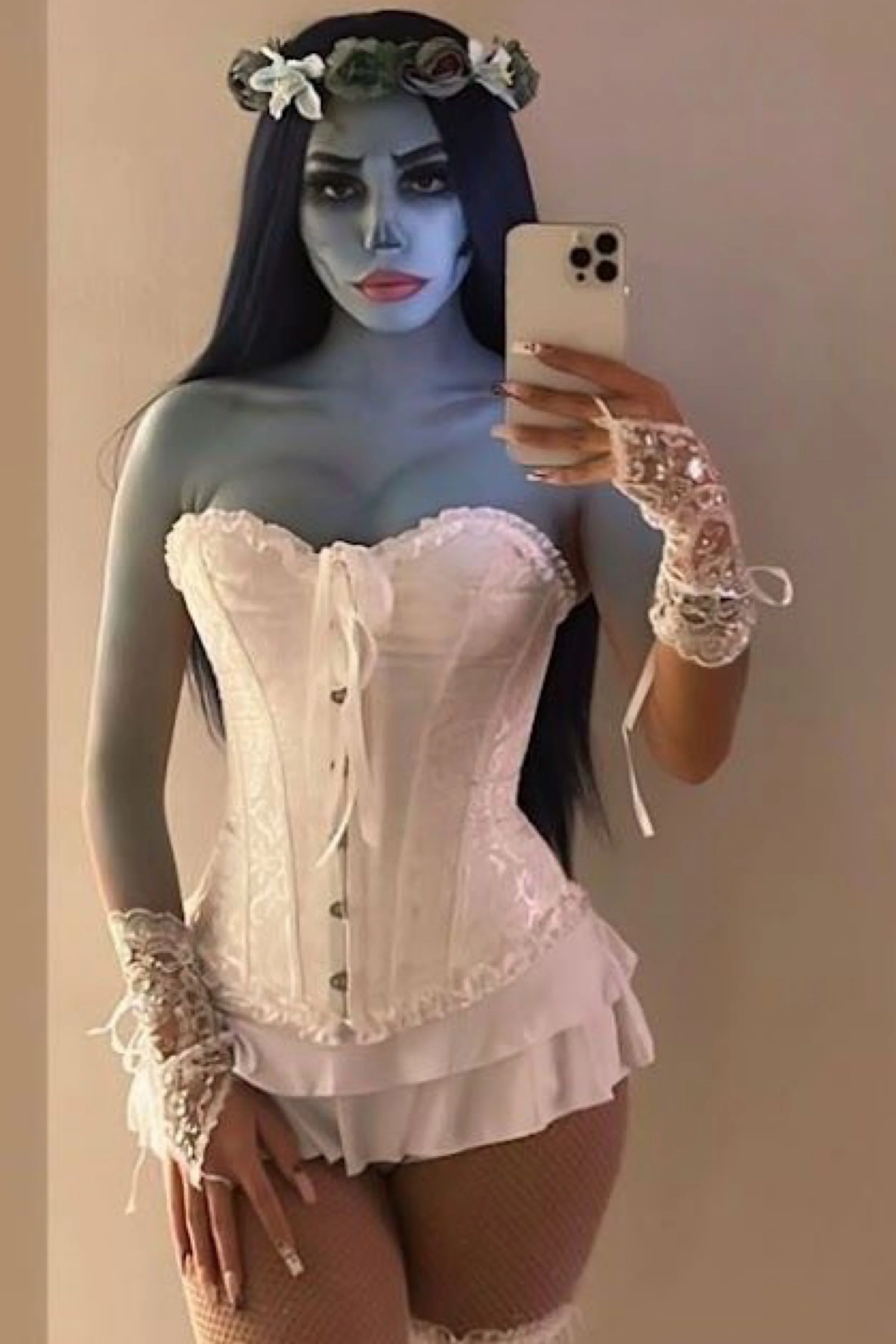 Keep this look cohesive by embracing the ethereal. Style with white or silver heels, and balance the drama of the corset with delicate lace or pearl accessories. For makeup, use a soft gray-blue gradient to sculpt the face and add shimmer along the collarbones for ghostly radiance. Long, straight hair or flowing waves keep it haunting yet beautiful. If recreating this for an event or shoot, dim lighting and cool tones enhance the mood. This outfit is ideal for Halloween parties, fantasy shoots, or costume galas—it embodies a ghostly glamour that transcends time.
