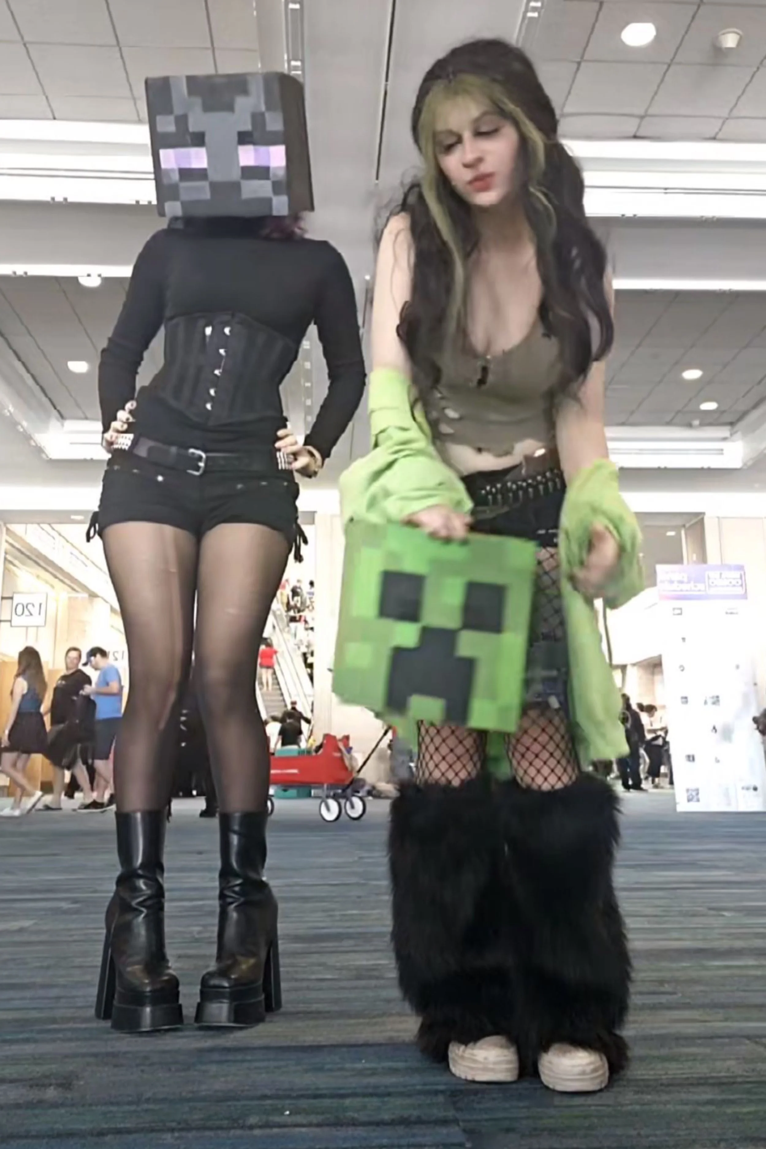 If you’re recreating this, blend structured and destroyed elements. The secret is in layering textures—fishnets under shredded fabrics, corsets over soft knits. For the Enderman, stick to dark monochrome tones, then add platform boots to elongate the legs. For the Creeper-inspired look, mix greens and blacks, then accessorize with belts, chains, and layered chokers. Messy hair and dark eyeliner enhance the punk vibe. Faux-fur leg warmers, plaid minis, and vintage cargo skirts work great for this aesthetic. A cardboard or foam cube prop adds instant recognition. Together, this duo shows how cosplay can evolve into fashion art.
