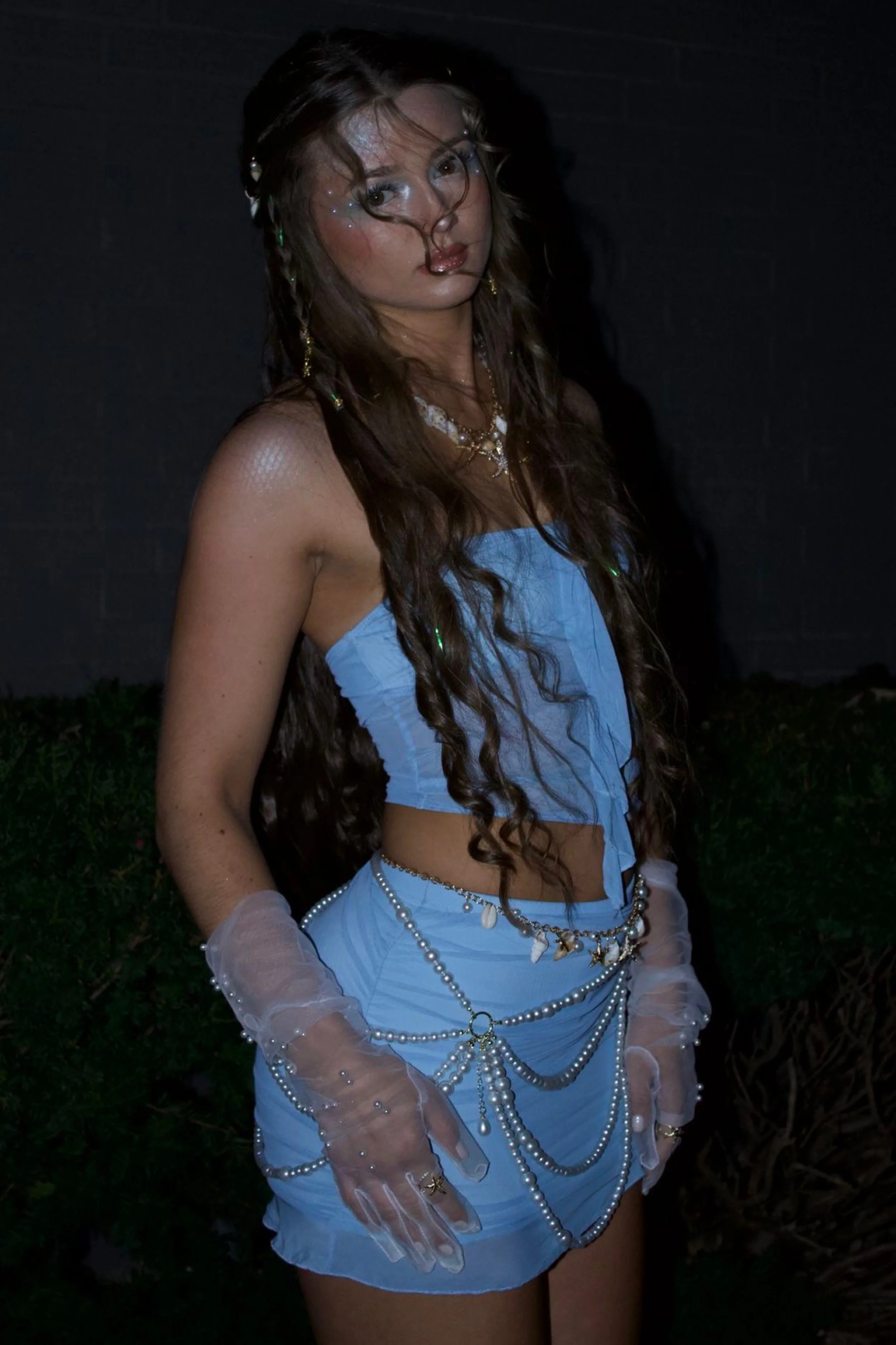 This look turns a mermaid dream into ethereal reality. A pale blue matching set—sheer crop top and ruched mini skirt—creates soft underwater flow. Pearls, shells, and layered chains shimmer like sunlight through water. The sheer gloves adorned with pearls add an elegant finishing touch, while subtle scale makeup along the temples glimmers in moonlight. It’s soft, mysterious, and breathtakingly feminine.