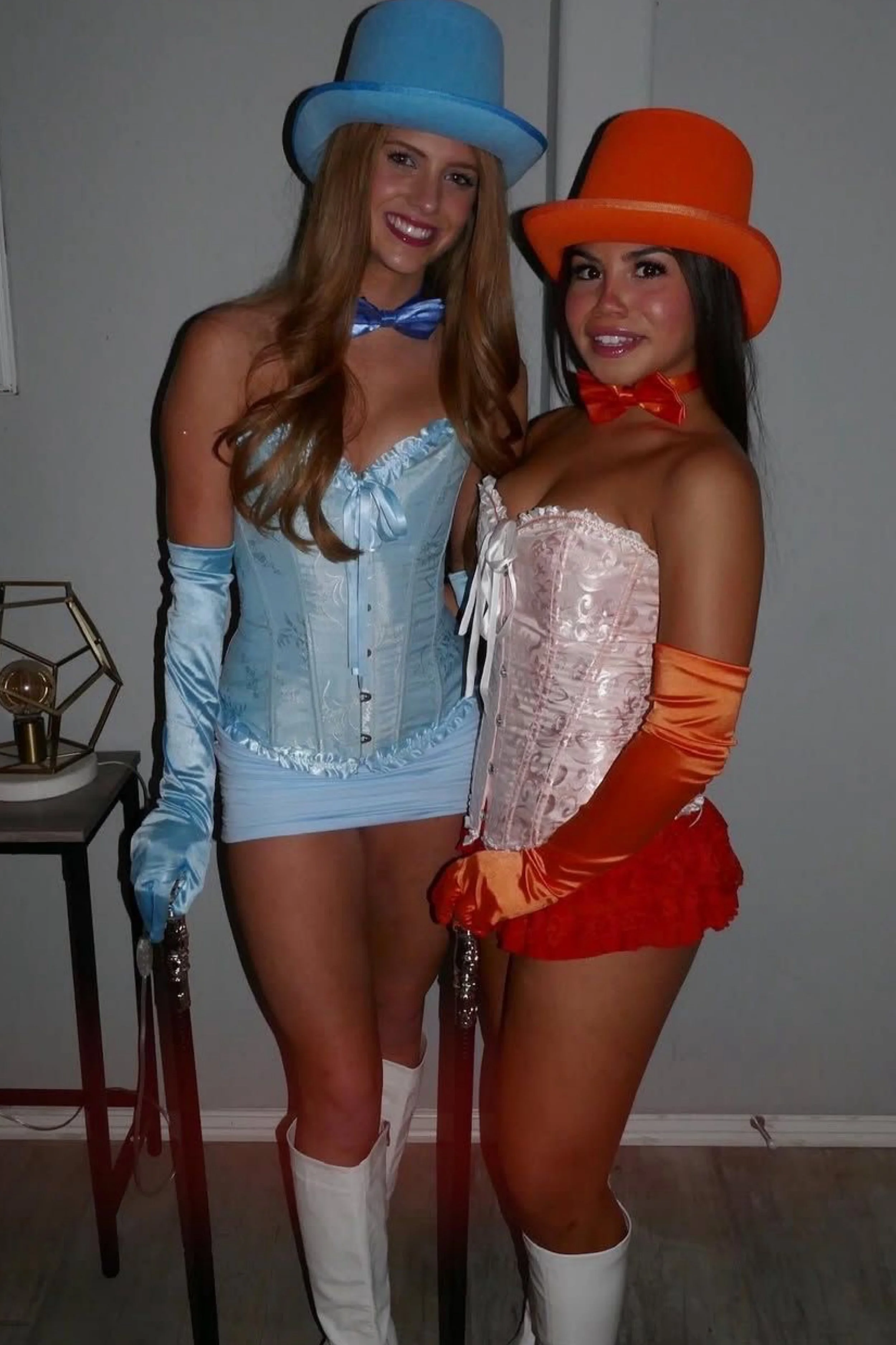 Nothing says cheeky sophistication like this duo-inspired costume. Corseted tops in pastel blue and peachy coral create a mesmerizing color contrast, paired with matching mini skirts, long gloves, and bold top hats. The satiny finish gives the look a flirtatious edge, and the bow ties add a playful touch that says “we came to charm.” White boots elongate the legs while balancing the candy-colored chaos with a classic foundation. Together, it’s pure visual delight—whimsical, confident, and just a bit mischievous.