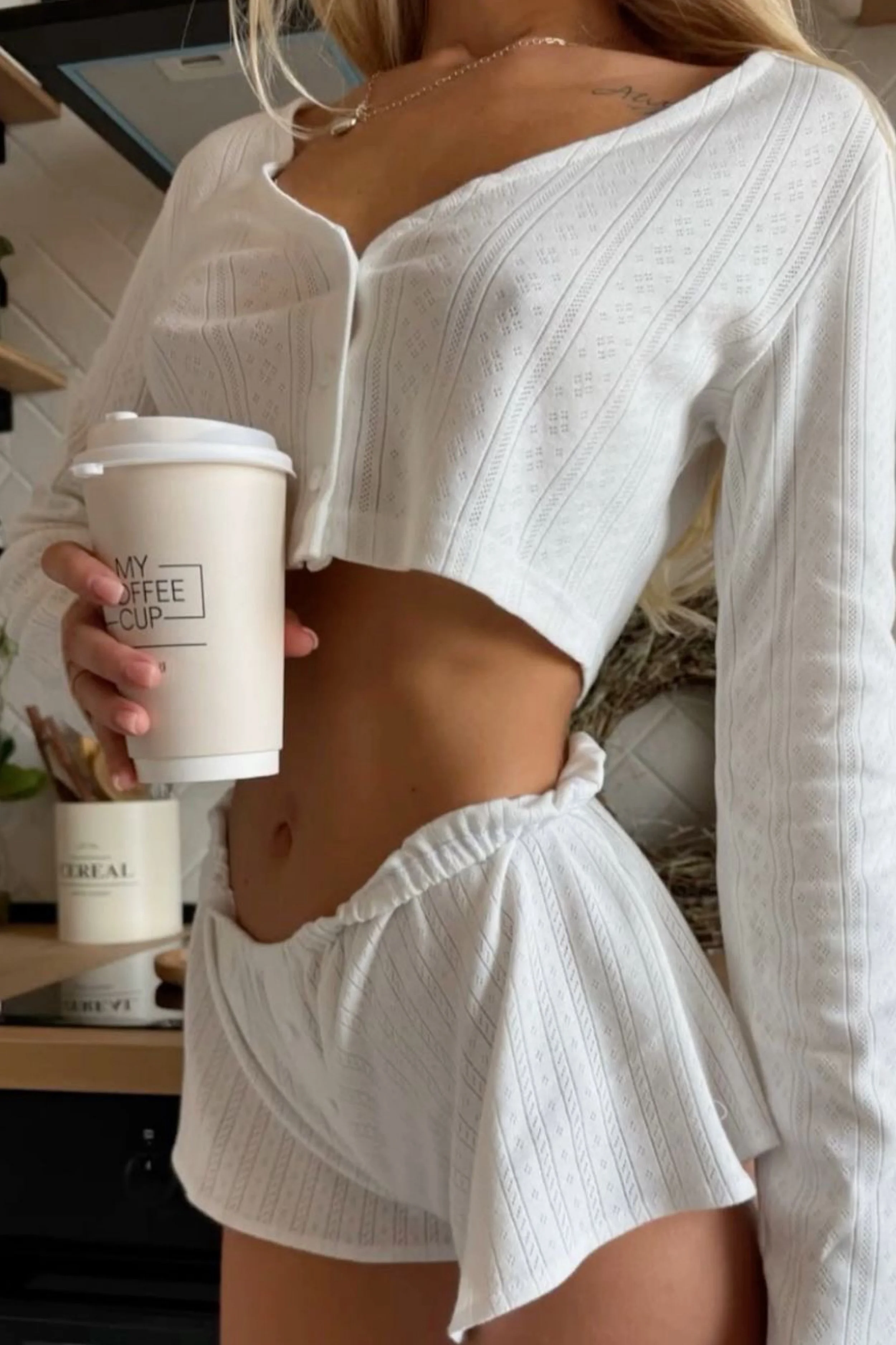 This look captures the beauty of simplicity—a white cropped button-up with matching knit lounge shorts. The fabric carries soft ribbing that feels both breathable and tactile, while the slightly flared hem of the shorts adds gentle movement. Together they create a clean, serene silhouette perfect for slow mornings and caffeine rituals. The pure white palette amplifies natural light, while the fitted yet relaxed cut celebrates form without restriction. It’s the kind of set that makes comfort feel intentional and chic.