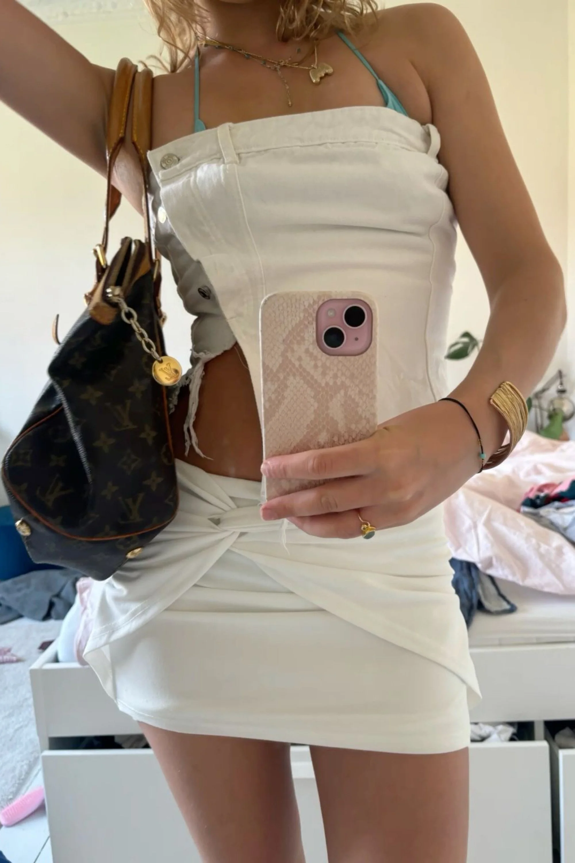 With a luxury monogram shoulder bag and layered gold jewelry, she’s playing with textures—distressed denim, buttery white cotton, and worn-in accessories. The bracelets and charm necklaces feel curated but collected, like souvenirs from different phases of her life. There’s a teal halter string peeking from beneath, hinting at a bikini underneath, as if this fit was thrown over swimwear for an impromptu afternoon turned night out.
