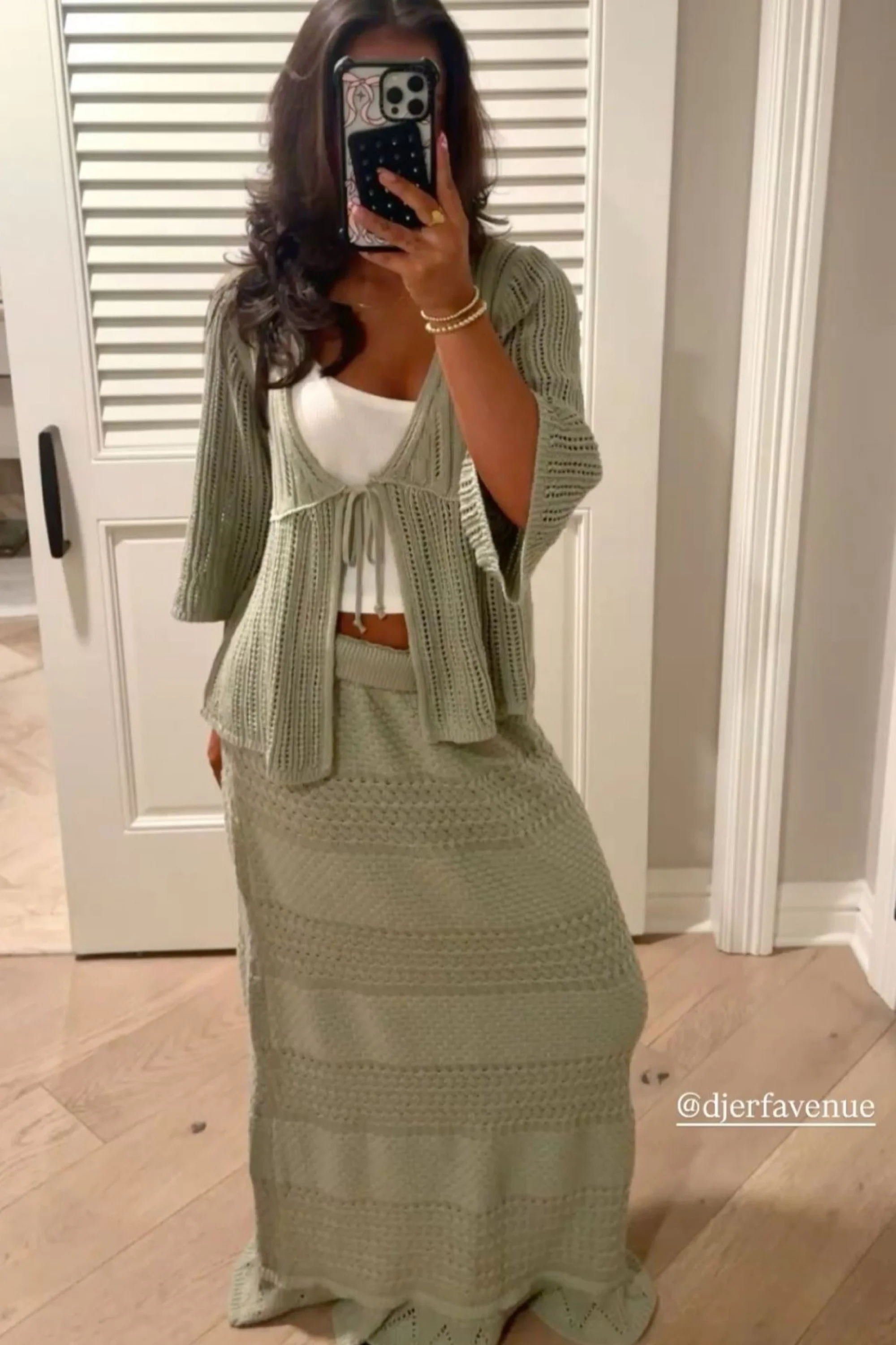 This look is what happens when your favorite beachwear takes a trip to the Amalfi Coast. The sage green three-piece crochet set features a drawstring crop top, a slouchy open-knit cardigan with wide sleeves, and a matching full-length skirt in mixed-texture knit panels. The movement is soft. The vibe is grounded. The texture is everything.