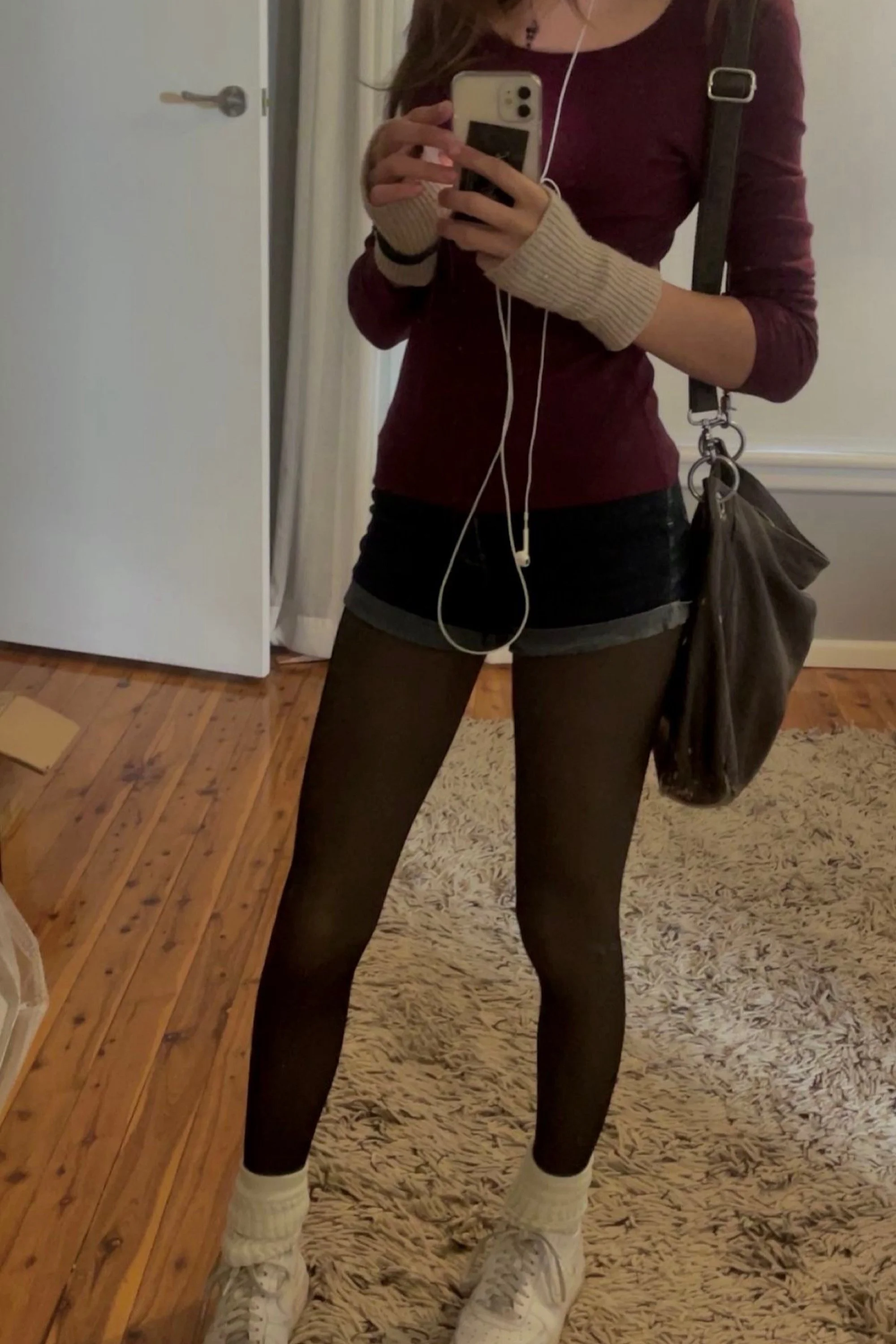 This look is the perfect mix of casual fall layering and indie-inspired street style, giving off an effortlessly cool, lived-in vibe. The base is a fitted, deep burgundy long-sleeve top — a rich, autumnal color that adds warmth and depth to the outfit. Paired with dark denim cutoff shorts layered over sheer black tights, the look achieves a perfect seasonal transition style: a little leg exposure balanced with warmth from the tights.
