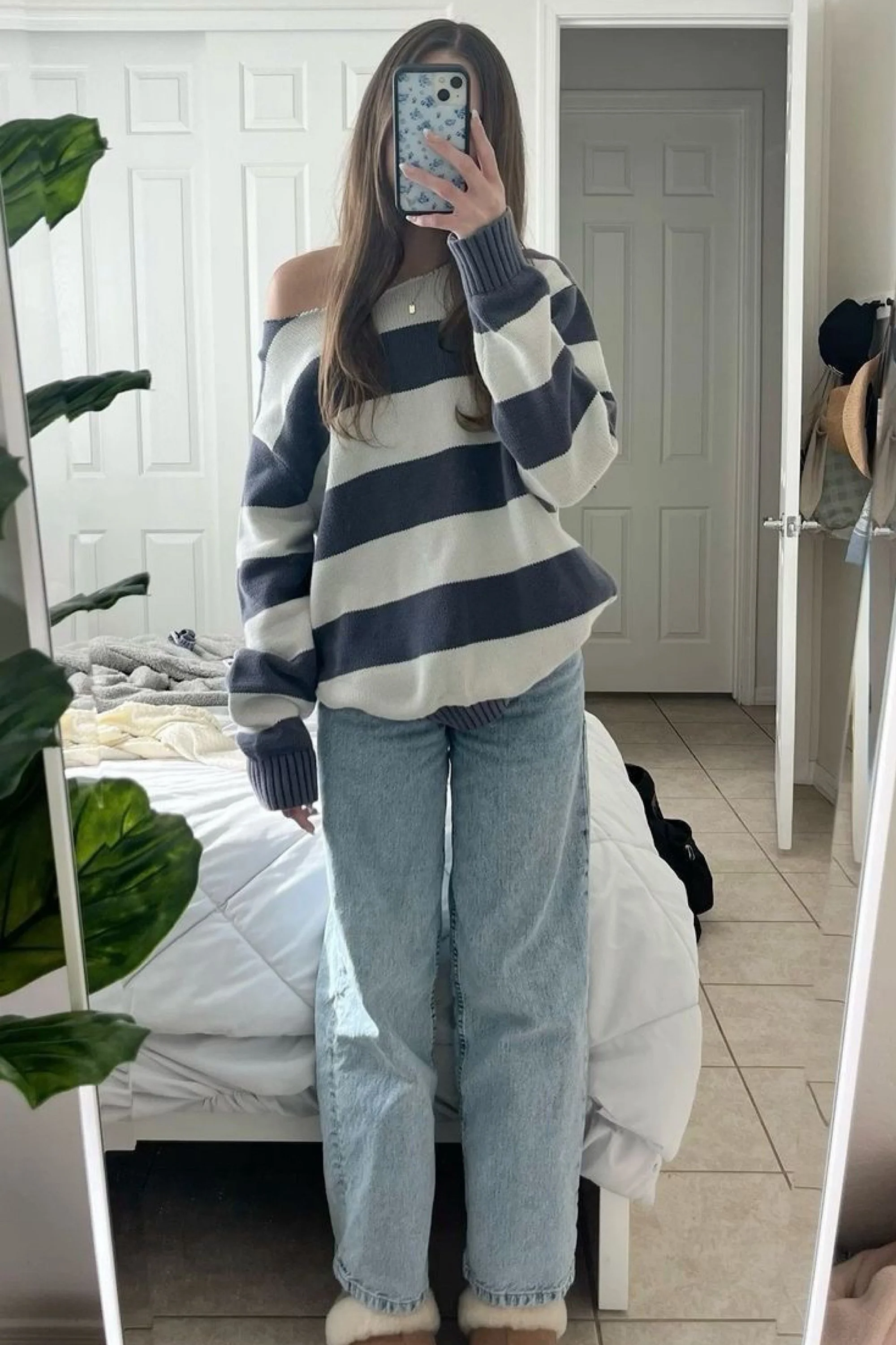 This look perfectly blends laid-back comfort with a subtle dash of flirtation, making it ideal for those crisp autumn days when you want to feel warm yet effortlessly stylish. The focal point is a loose-knit, oversized sweater with bold navy and cream horizontal stripes. The off-the-shoulder drape adds an unexpected, feminine twist to an otherwise casual staple, letting you show a little skin while still staying snug.