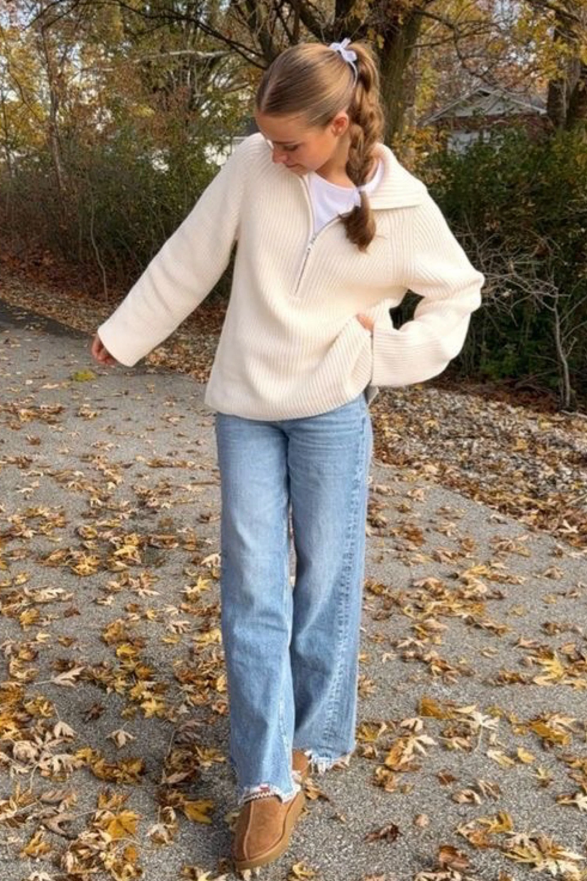 This outfit embraces fall’s relaxed charm with a combination of soft knits, classic denim, and casual footwear. The highlight is the cream ribbed half-zip sweater, a piece that blends minimalism with warmth. Its loose fit and dropped shoulders give it a relaxed drape, while the half-zip detail adds a subtle sporty edge. Layered over a plain white tee, the look gains an easygoing, layered feel that’s perfect for crisp autumn afternoons.