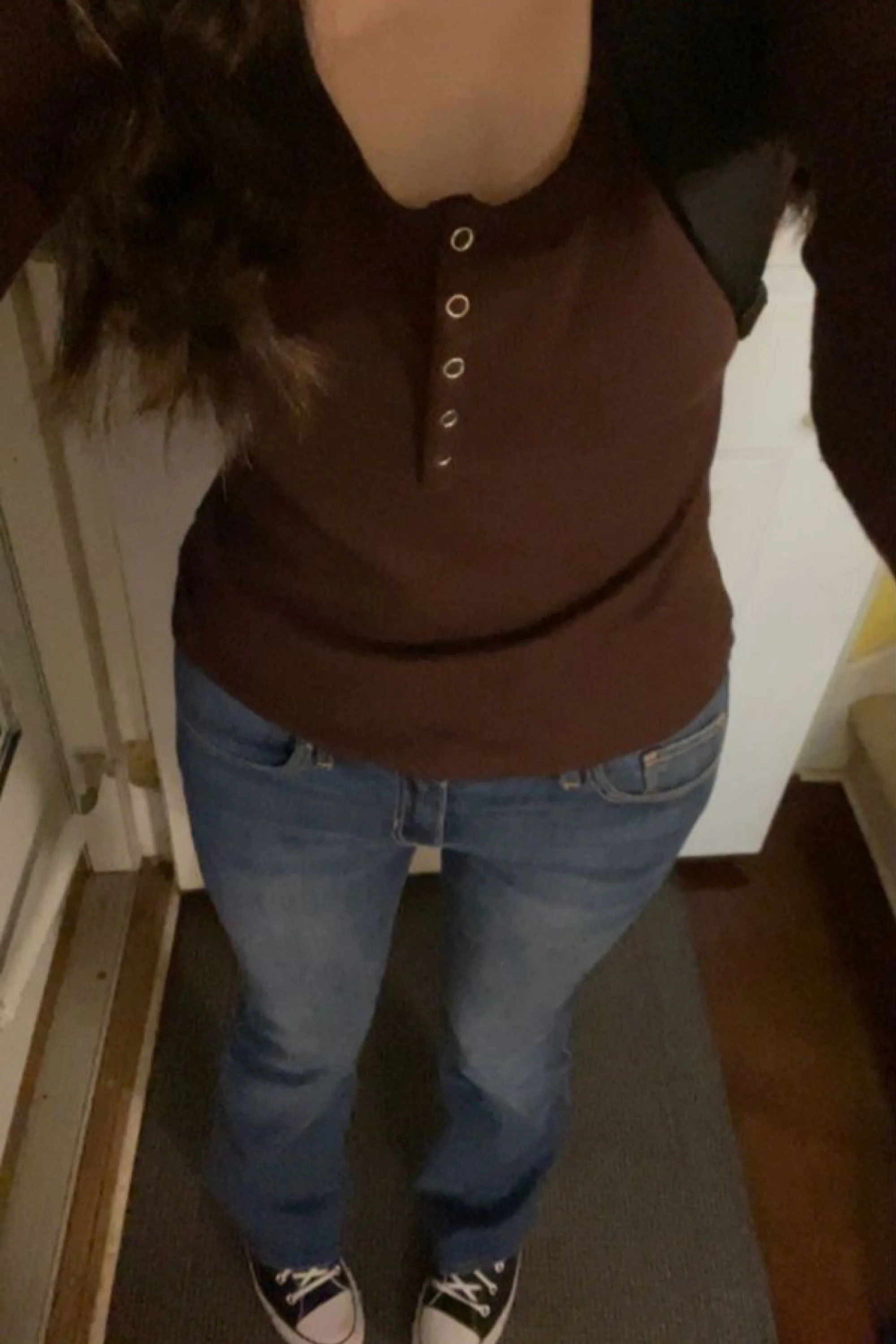 This look captures the essence of laid-back fall style, built around the warmth of a chocolate brown henley top. The fitted silhouette and button-front neckline give the outfit just enough detail to stand out while keeping things easy and wearable. The rich brown tone is flattering for autumn, pairing beautifully with the natural light and deeper seasonal hues.
