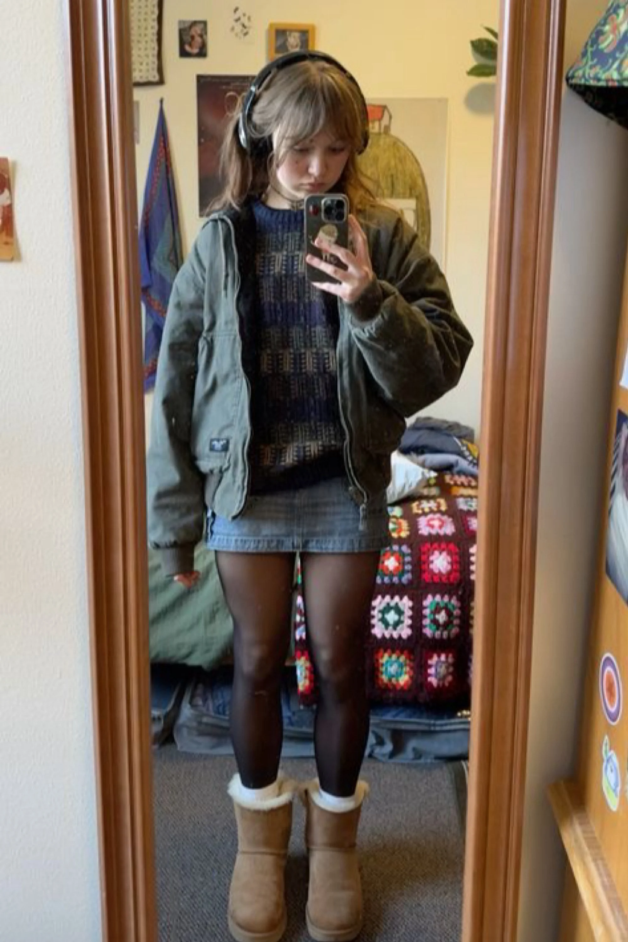 This look blends the casual grunge revival of the late 90s with the warmth and ease of modern fall fashion. The oversized olive bomber jacket brings an effortless, lived-in charm that feels perfect for cooler mornings. Layered underneath is a textured knit sweater in navy with subtle geometric accents, adding depth without overwhelming the outfit. The mini denim skirt channels classic casual chic, striking a perfect balance between relaxed and flirtatious. Black semi-sheer tights elongate the legs and introduce a layer of warmth, keeping the skirt season-appropriate. The standout footwear choice — shearling-lined tan suede boots — adds a soft, cozy contrast to the darker top layers, pulling the look toward a more autumnal and approachable mood.