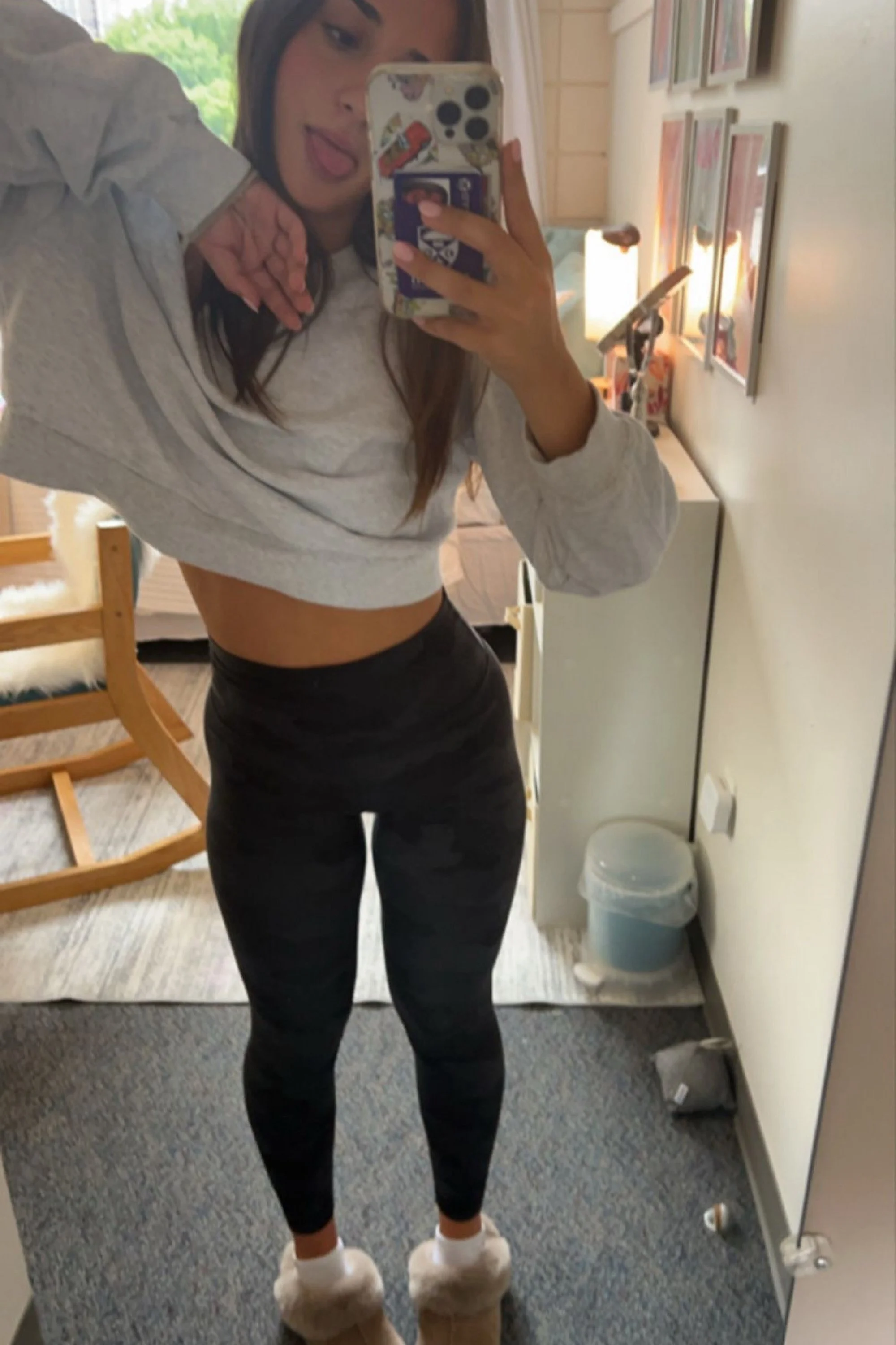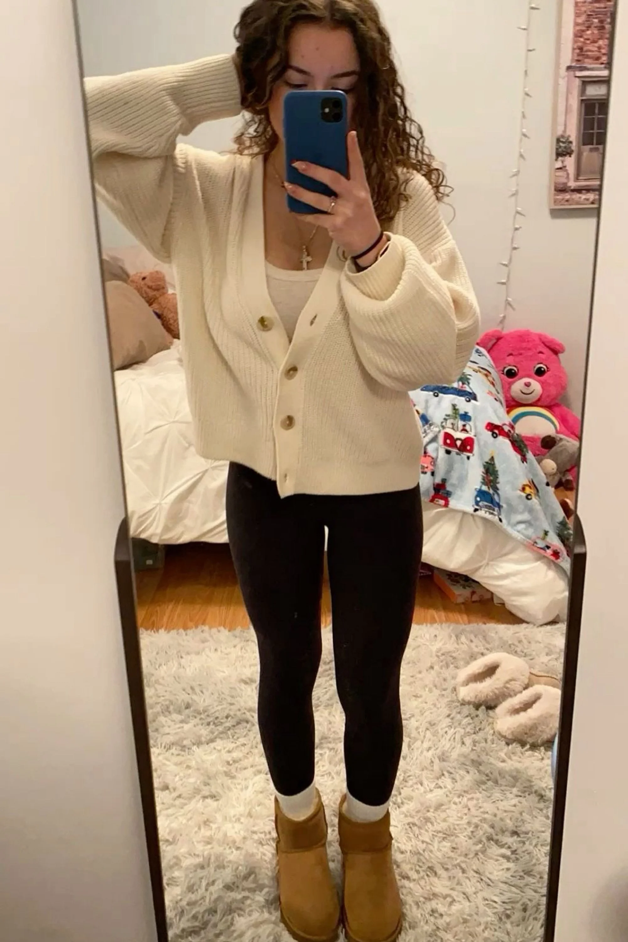 To recreate this look, opt for an off-shoulder or wide-neck sweater in a light neutral — ivory, cream, or soft beige are perfect. Cropped lengths work well with high-waisted leggings, creating a flattering waistline while maintaining comfort. Black leggings are an easy staple, but switching them for faux leather leggings could instantly elevate the outfit.