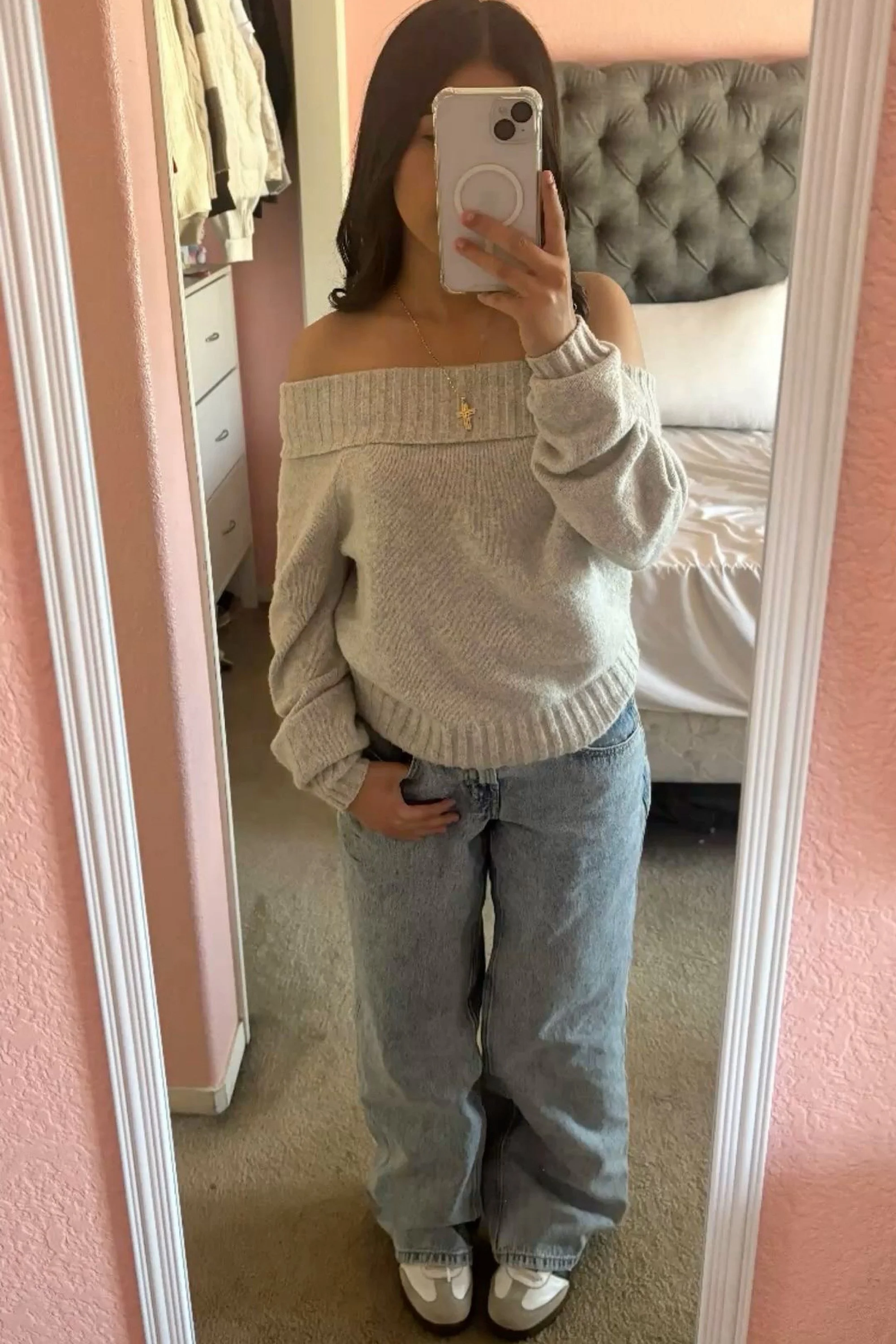 This look is a perfect balance of comfort and elegance, built around the timeless appeal of an off-shoulder sweater. The light gray knit features a wide fold-over neckline that sits effortlessly across the shoulders, creating a subtle yet striking frame for the collarbone. Its soft ribbed texture and slightly slouchy sleeves give it a cozy, approachable feel while still maintaining a feminine silhouette.