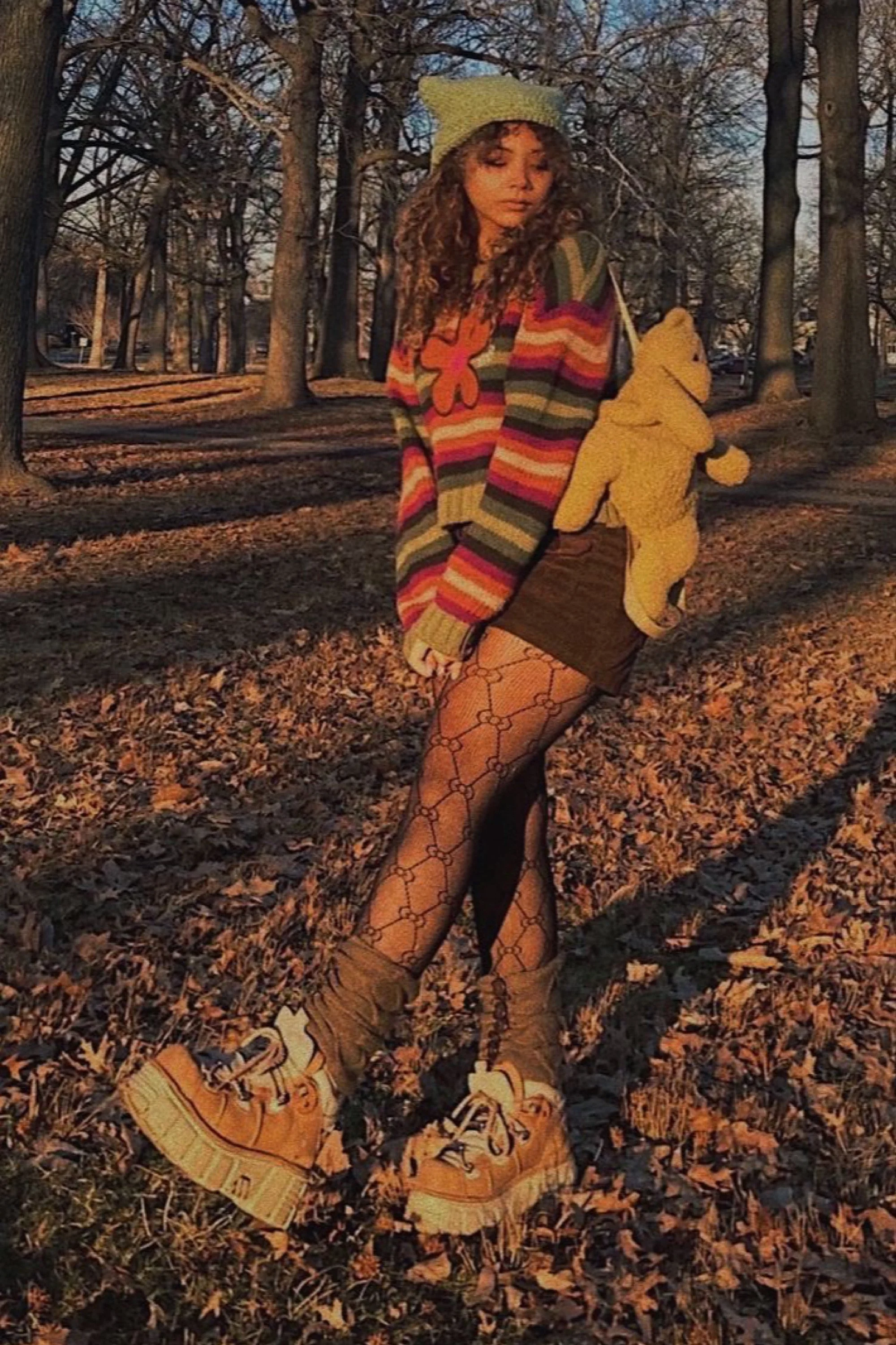 If you want to recreate this outfit, start with a colorful striped sweater that has a quirky or retro detail. The key is to pair it with a solid neutral skirt to let the sweater shine. Logo or patterned tights will instantly add a luxe touch, but solid opaque tights can work for a toned-down version. Chunky platform sneakers are ideal for giving height and an alternative streetwear feel, though you could switch to lace-up boots for a more grounded, seasonal vibe.