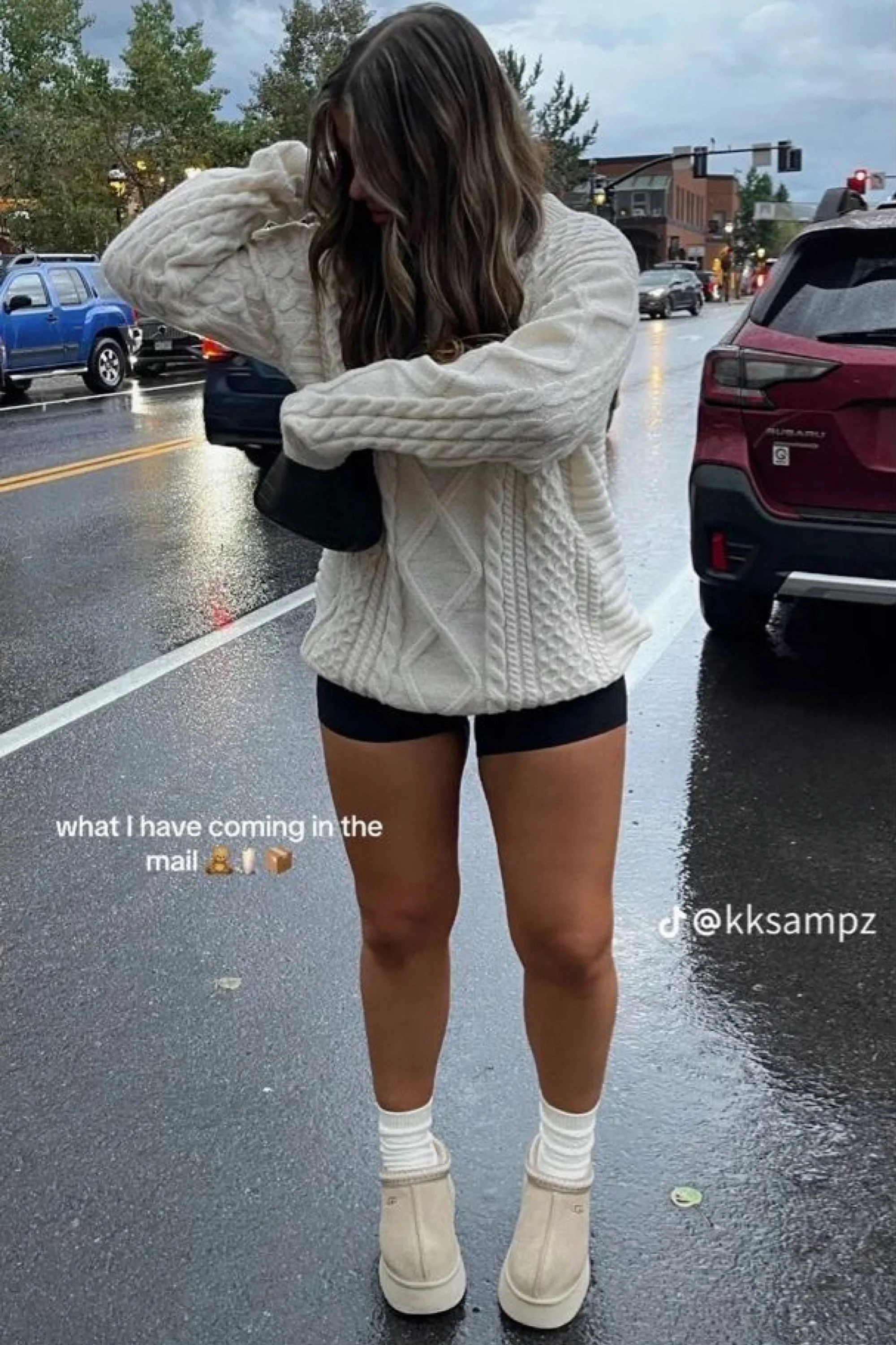 To recreate this look, start with an oversized cable-knit sweater in a light neutral. The bigger and softer, the better, as it becomes the statement piece of the outfit. Pair with fitted shorts for contrast — cycling shorts, as seen here, keep the sporty vibe strong. You could also try denim cutoffs for a more casual, summer-meets-fall twist.
