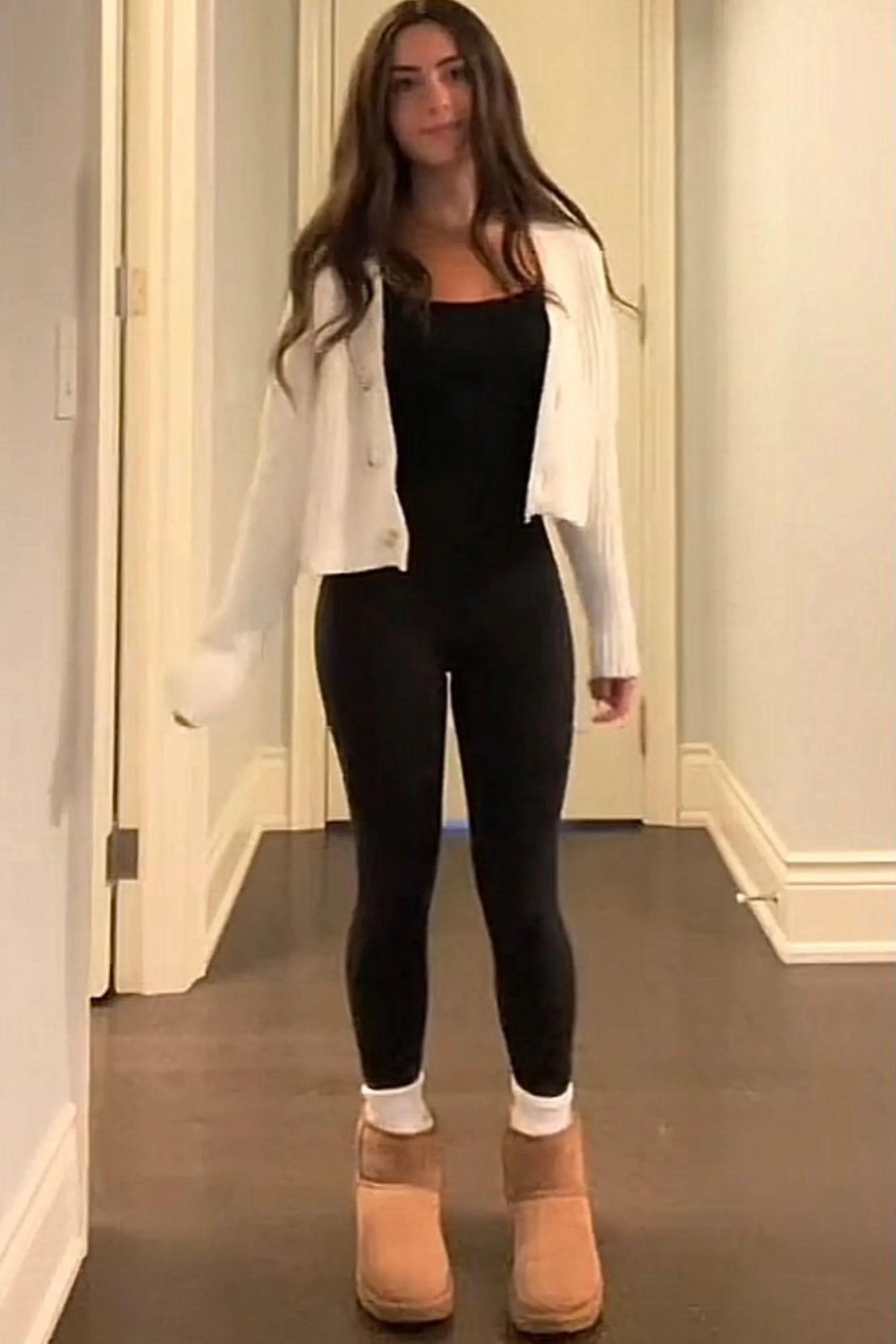Black leggings form a streamlined base, keeping the outfit grounded and letting the sweater shine. The leggings’ fitted cut contrasts beautifully with the sweater’s loose knit, creating balance in proportions. Completing the look are gray suede ankle boots with a shearling lining, paired with white socks peeking out above the boot shaft for a casual, layered touch. The neutral palette of white, black, and gray makes the look versatile while also feeling seasonally fresh.