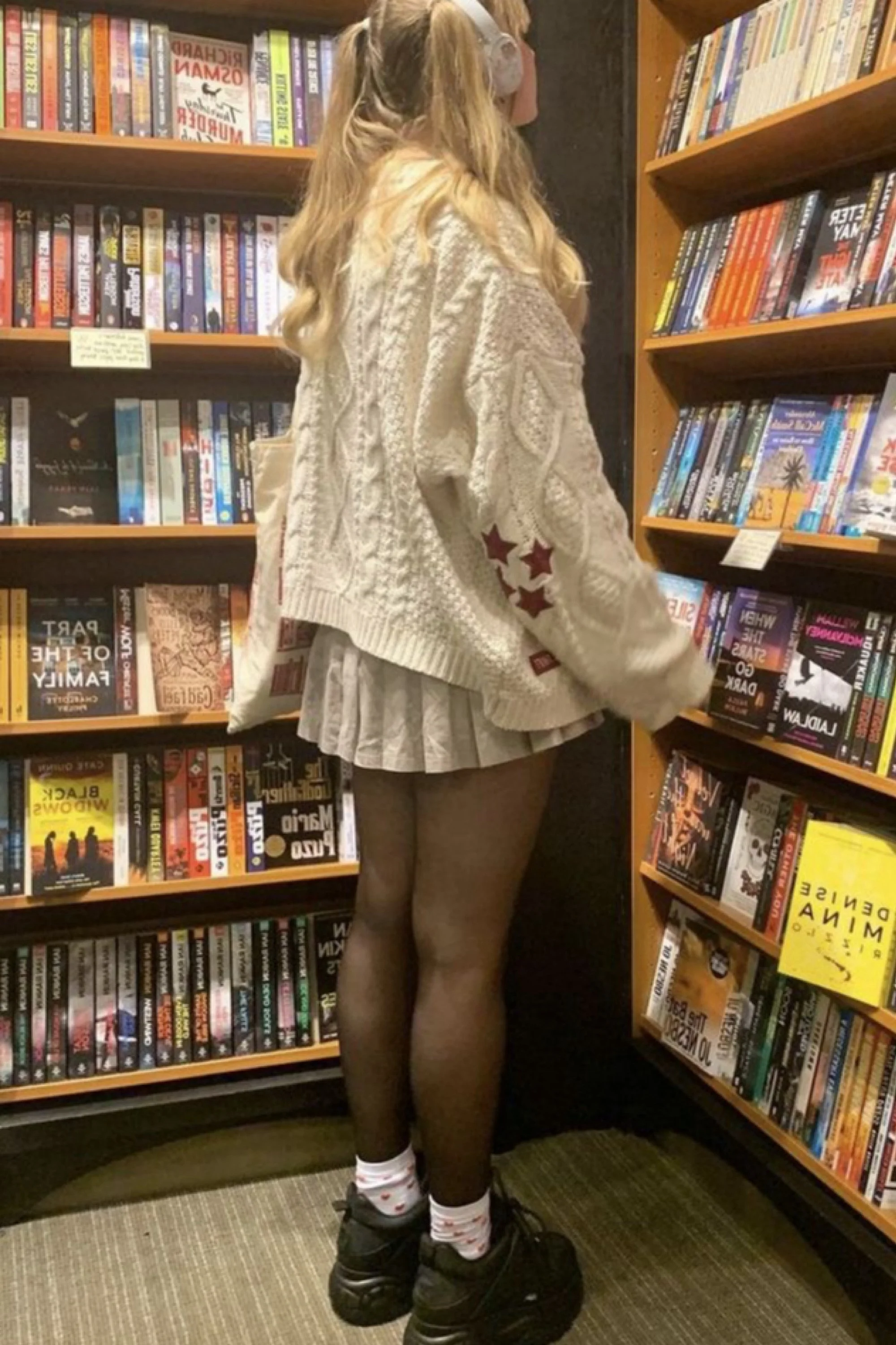 This outfit perfectly blends soft academic style with playful streetwear, creating a look that feels effortlessly at home between bookstore shelves or on a crisp autumn afternoon coffee run. The oversized cream cable-knit sweater is the hero piece, delivering warmth and texture while giving a relaxed, cozy vibe. Its detailed knitting and the playful red star appliqués on the sleeves make it more than just a basic knit — it becomes a statement without shouting. Underneath, a soft pleated mini skirt in a neutral beige tone keeps the outfit light and flirty. The gentle movement of the skirt contrasts beautifully with the chunky texture of the sweater, creating a balanced silhouette.