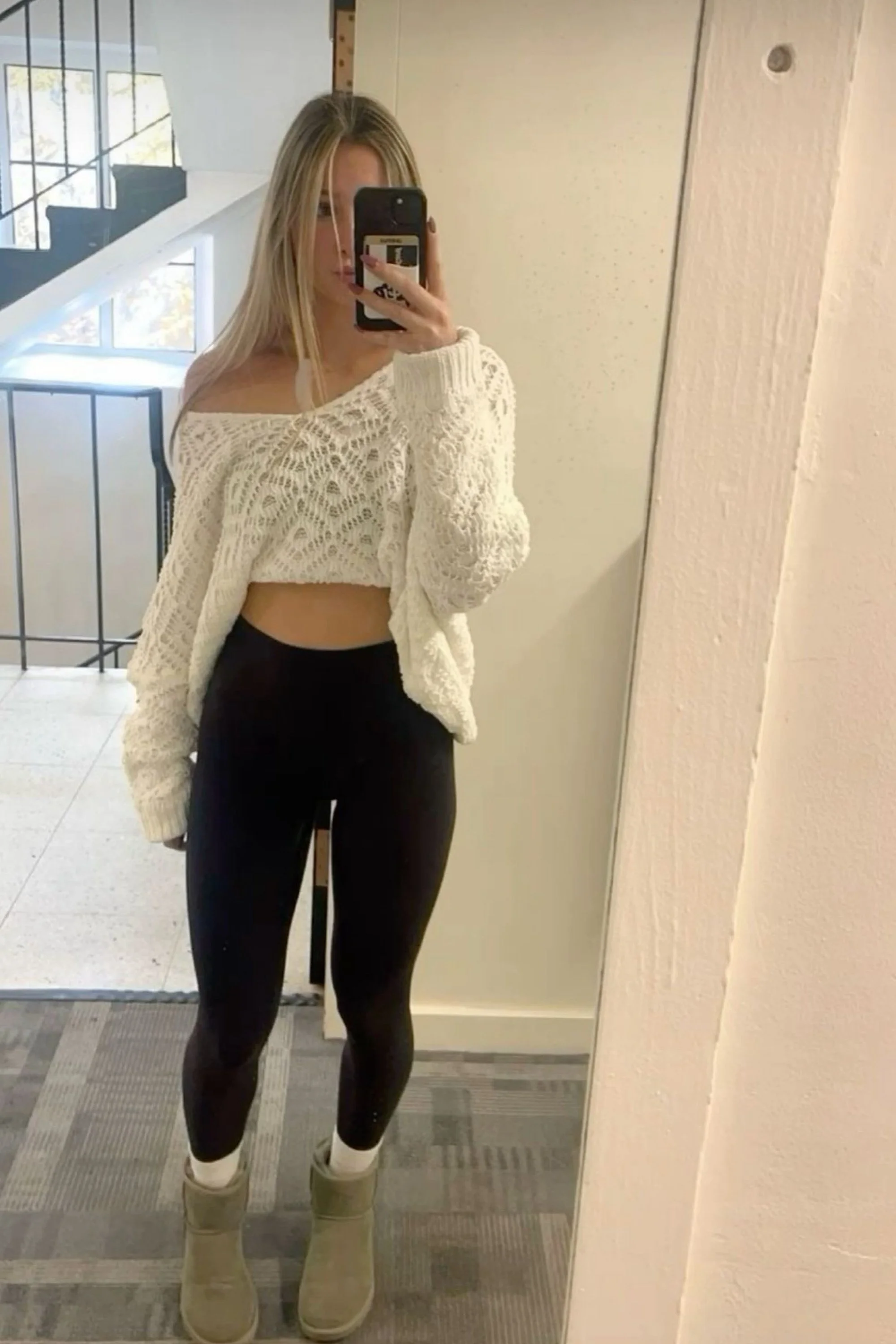 This outfit is a perfect mix of cozy texture and effortless silhouette, balancing a soft, romantic top with sleek, everyday leggings. The focal point is the cropped off-shoulder knit sweater in white, featuring an airy open-weave pattern that adds depth and visual interest. Its relaxed neckline creates an easy, draped effect that subtly frames the shoulders, giving this casual look a touch of femininity.
