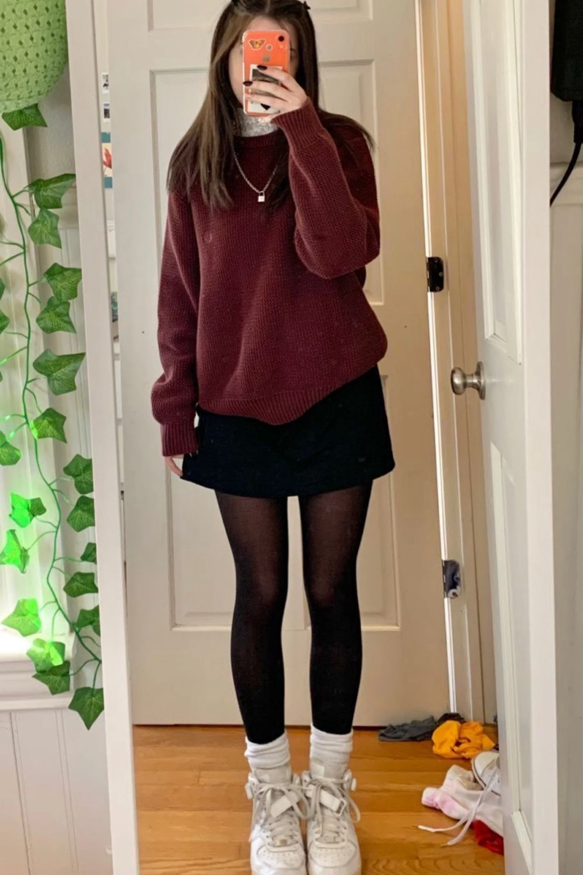 If you want to recreate this look, focus on finding an oversized sweater with a standout detail — it could be embroidery, patchwork, or a bold knit pattern. Keep your skirt lightweight and in a neutral shade to balance the chunky upper half. Semi-sheer tights are key for keeping the outfit season-appropriate, but you could also experiment with patterned tights for extra personality. For shoes, chunky sneakers work perfectly for comfort and trendiness, but you could also switch to ankle boots for a slightly more dressed-up vibe.