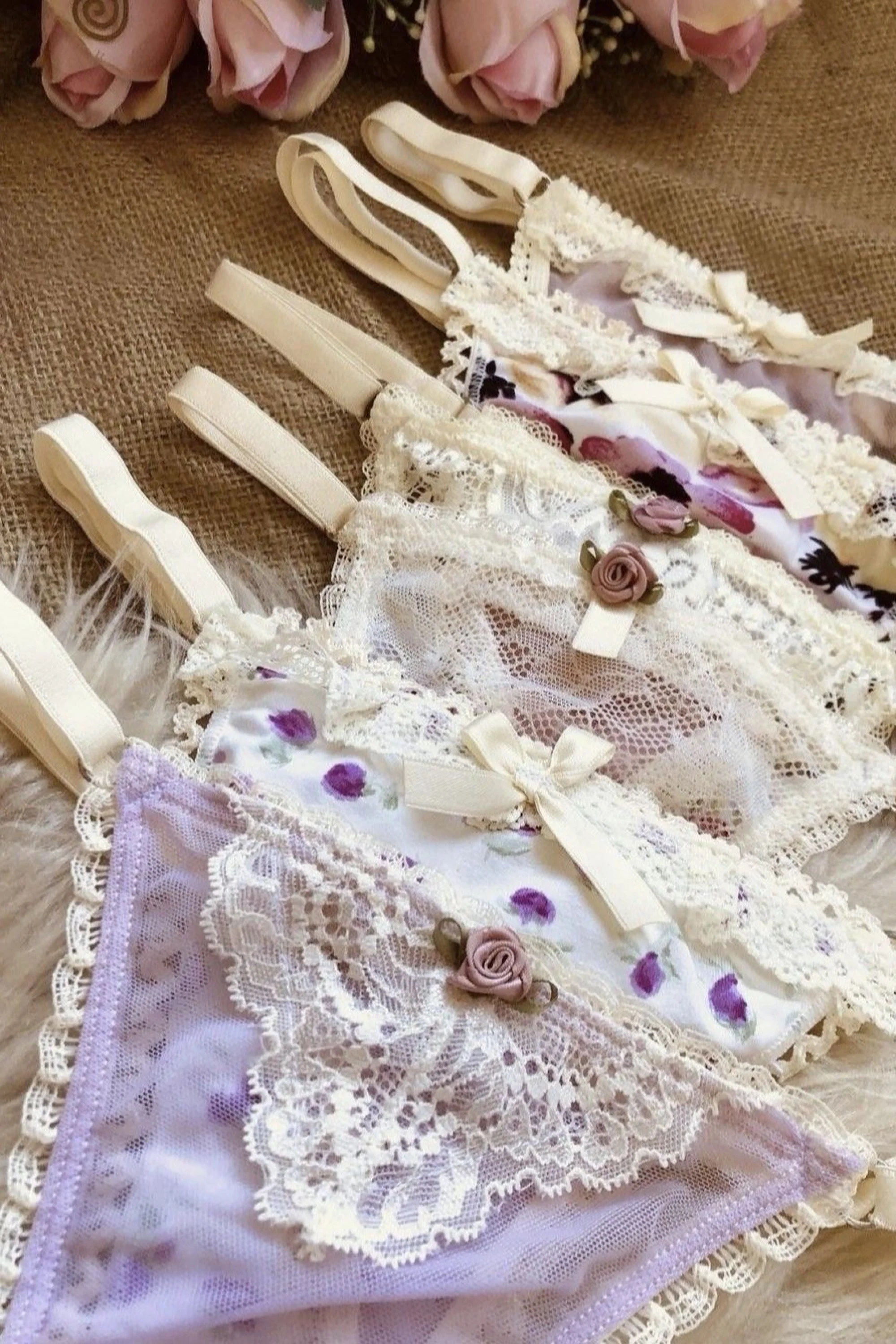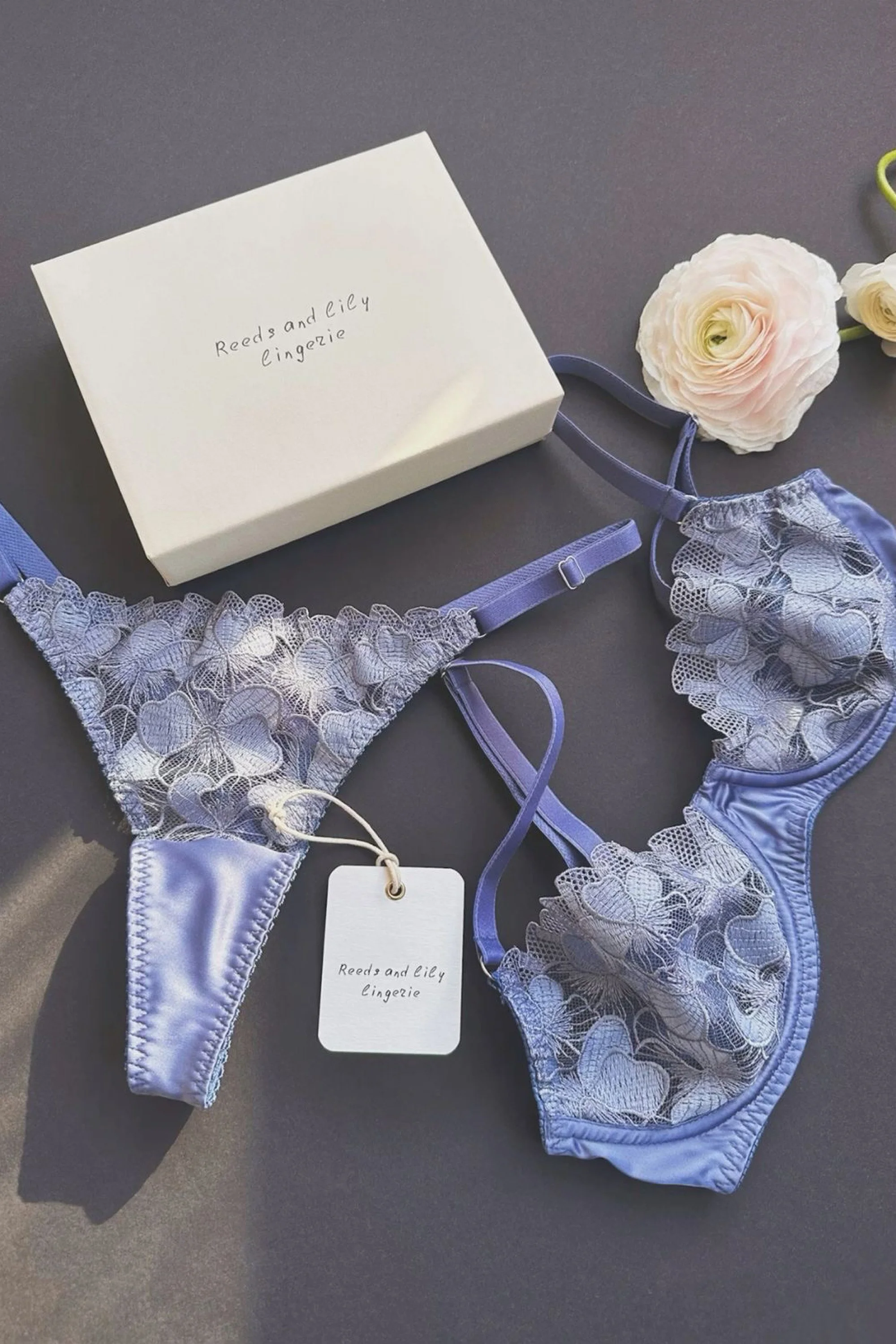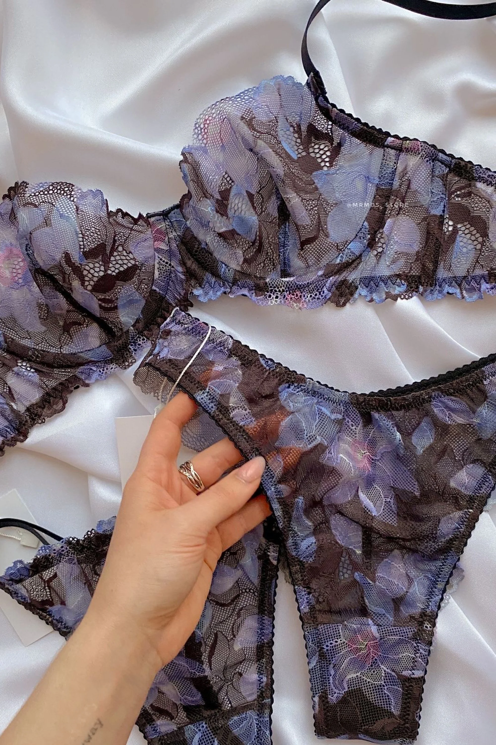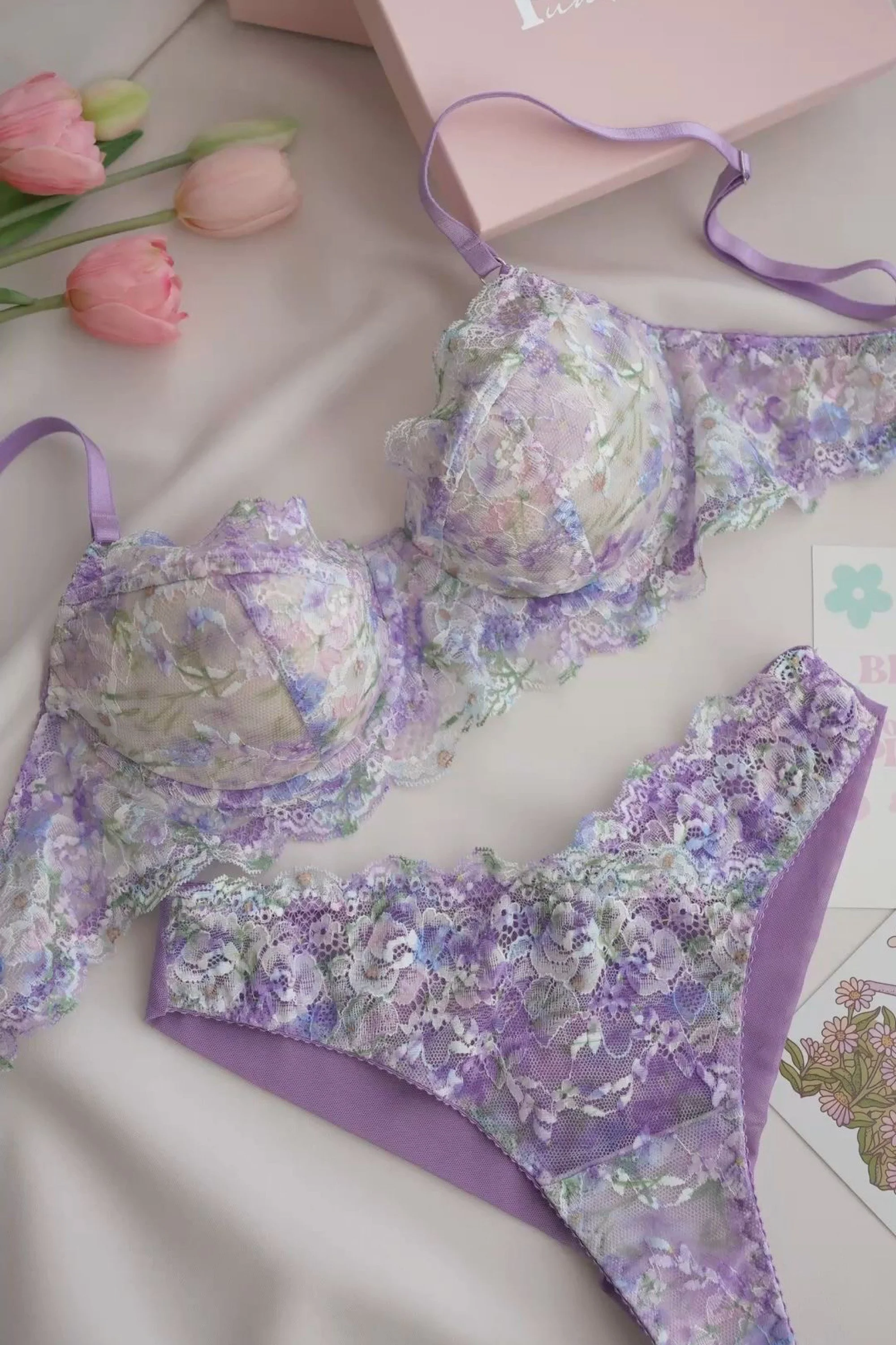 This soft lilac floral lace lingerie set is pure spring romance with a commanding edge. Its pastel tones pair beautifully with sheer white or cream robes for a light, airy mood, or with deep plum accessories to draw out the richness in the embroidery. The lightly lined cups of the bra give shape without overpowering the lace’s delicacy, while the panties’ scalloped edges make them perfect for pairing with high-waist skirts or silky pajama bottoms. For an alluring touch, wear with an open cardigan and delicate jewelry to let the lace peek through naturally.