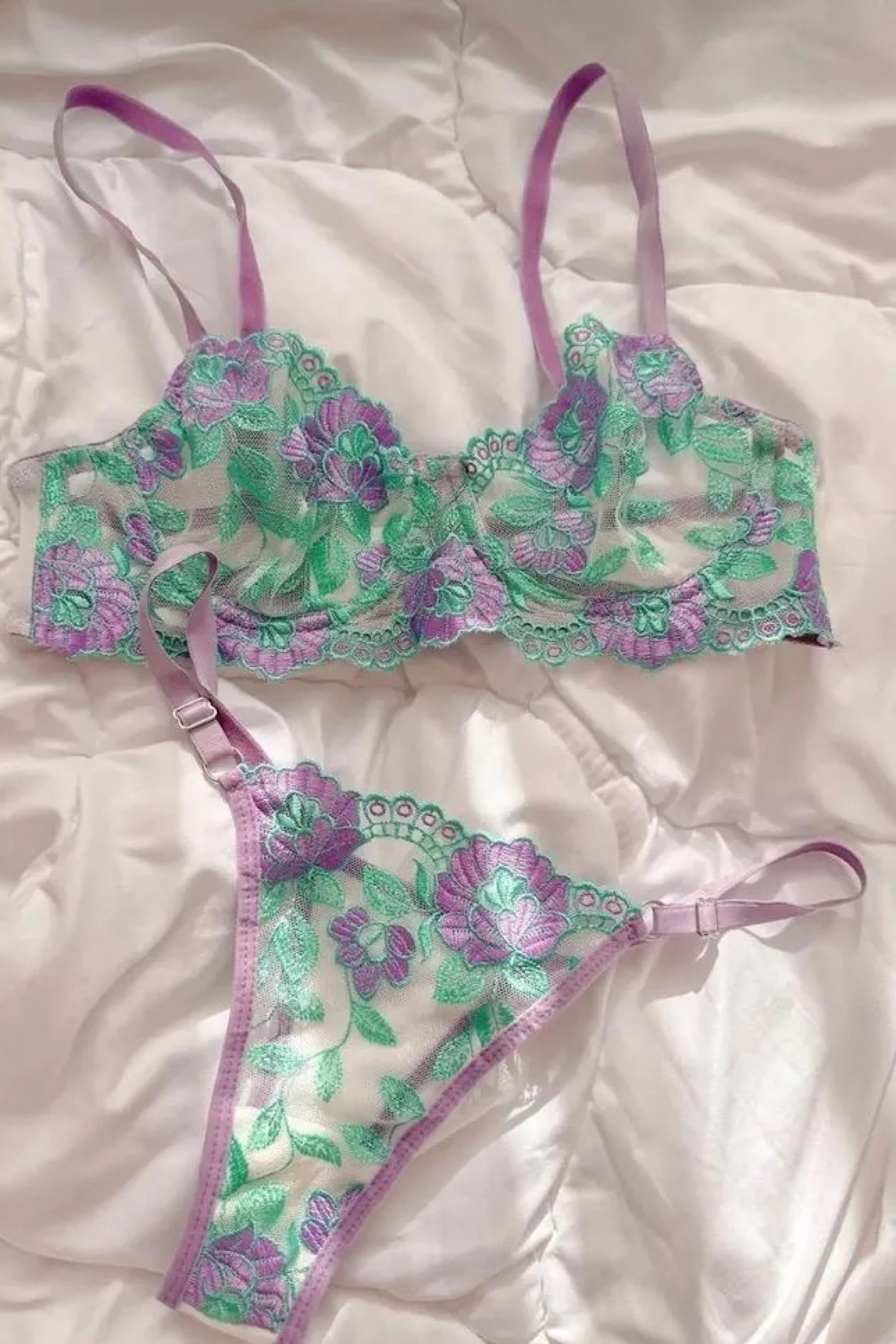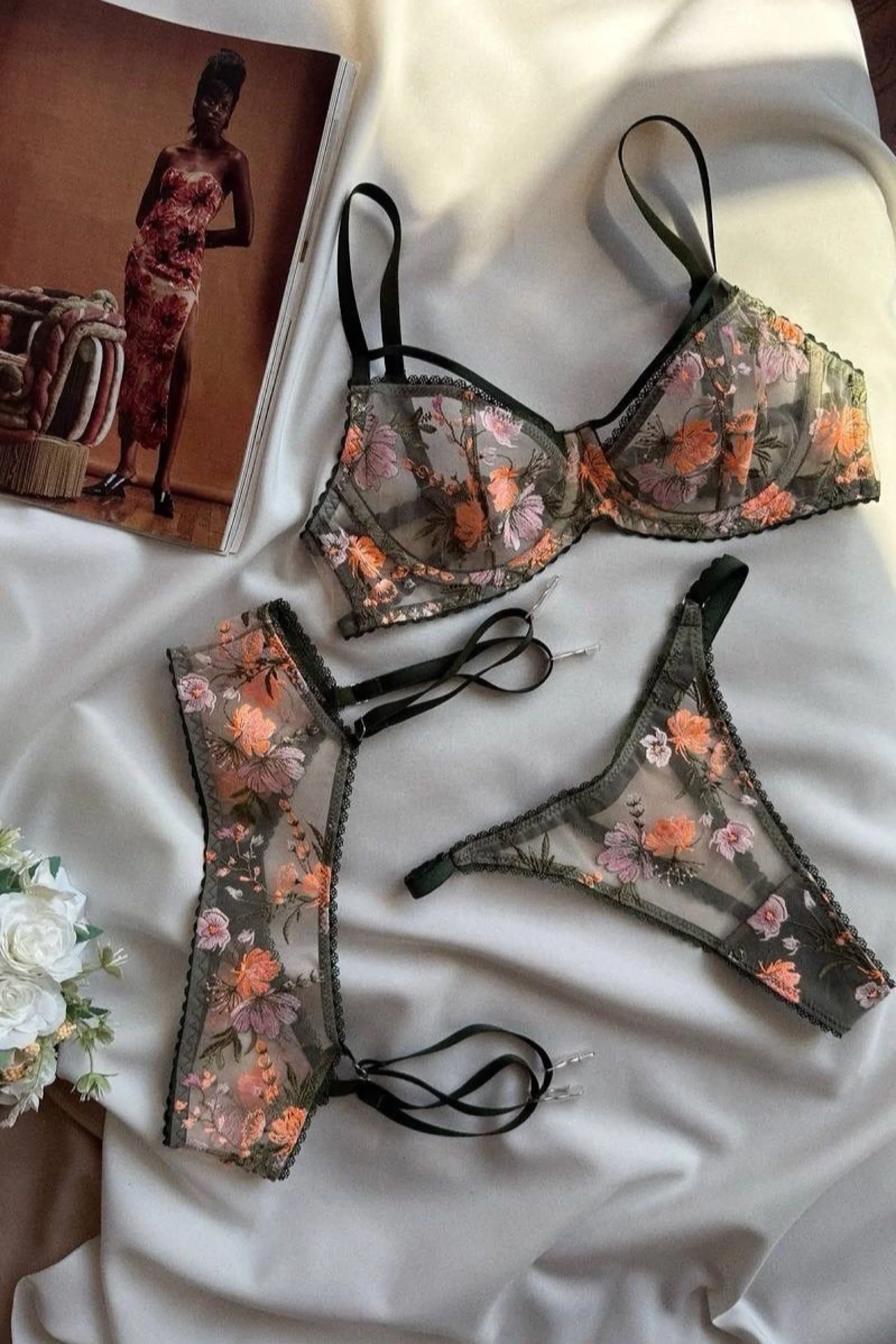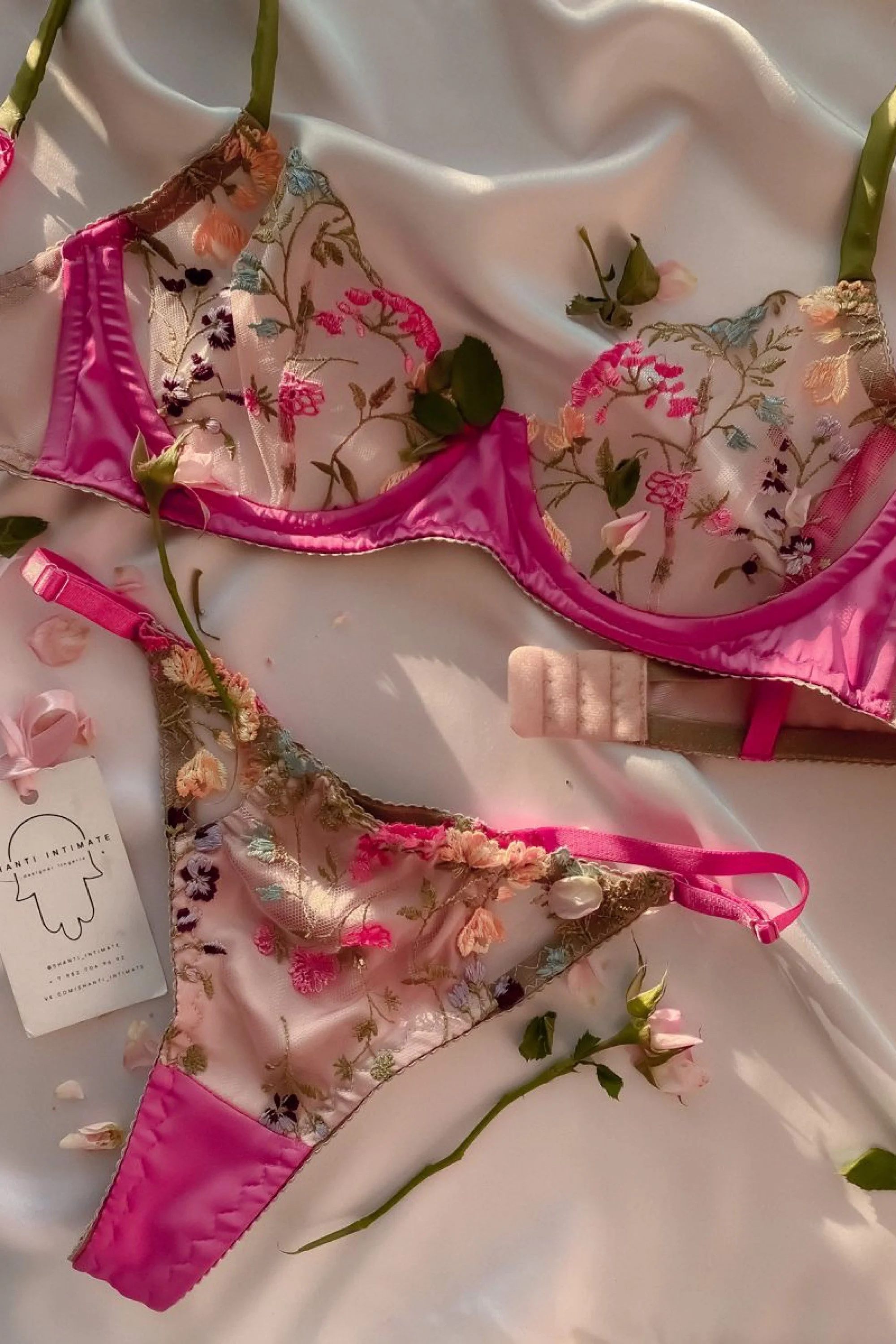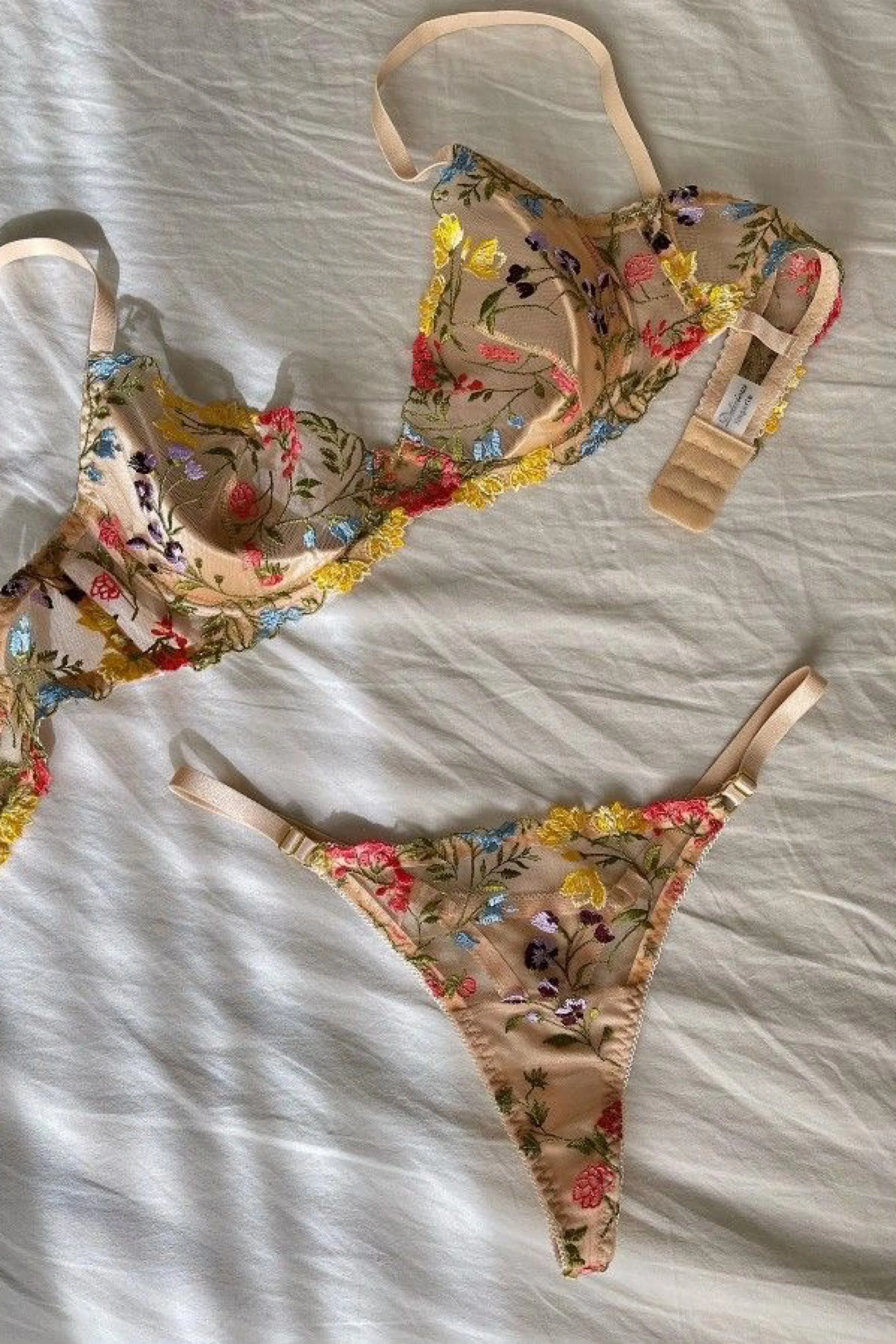 Nude mesh with multicolor floral embroidery is both romantic and commanding. Let the set lead and echo its palette rather than compete. For daytime layering wear a cream knit dress or a pale slip that skims rather than clings and allow a whisper of embroidery to show at the neckline if the moment is private. For evening pair with an ivory silk robe and a soft gold anklet to repeat the warm tones in the stitching. Keep makeup fresh with rosy cheeks and a clear gloss. Hair pulled into a low bun or a loose braid lets the focus remain on the bra and panties. Fragrance with notes of jasmine or vanilla will harmonize with the meadow mood.