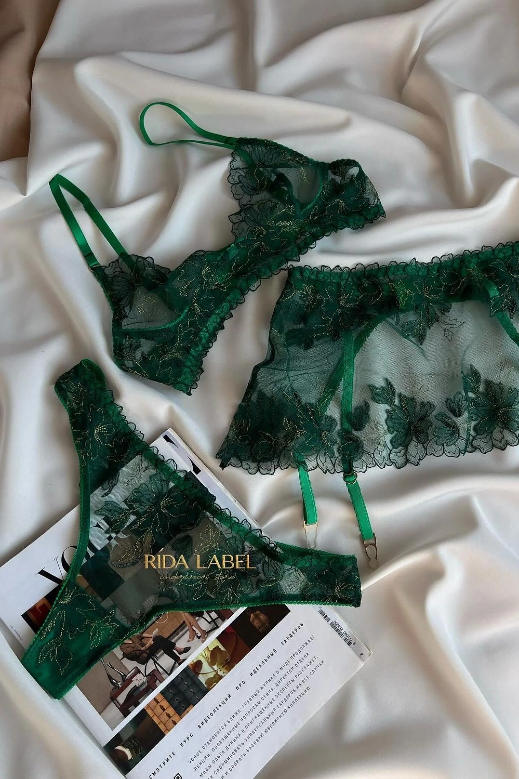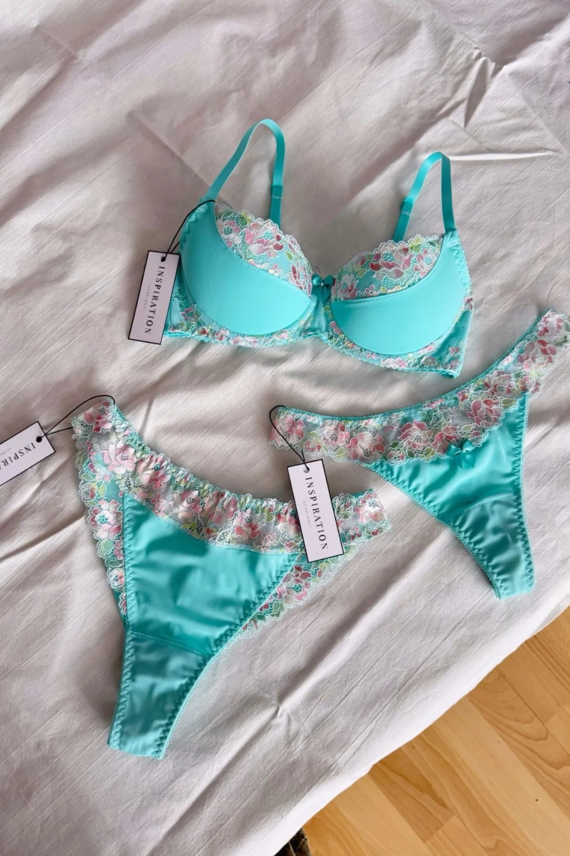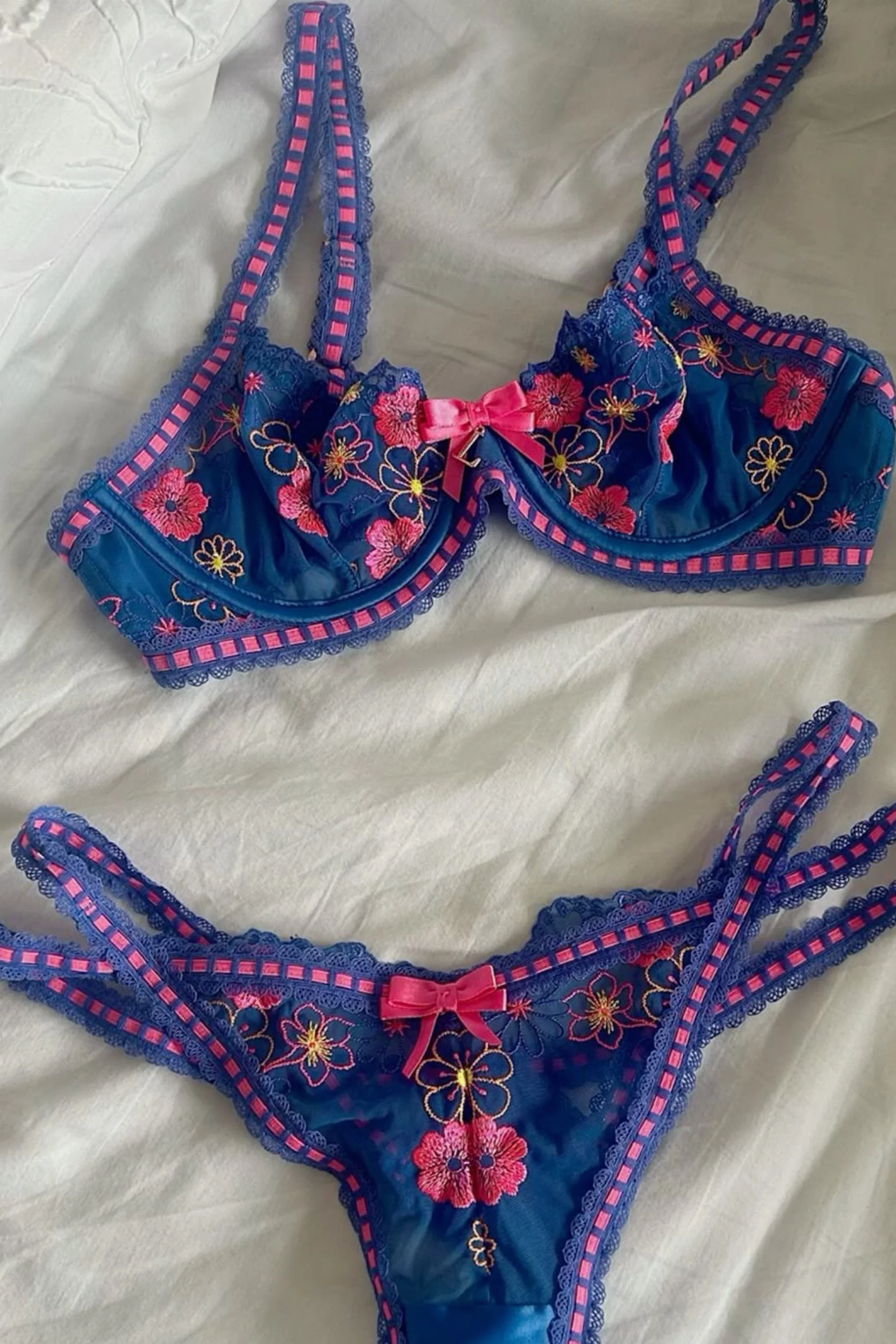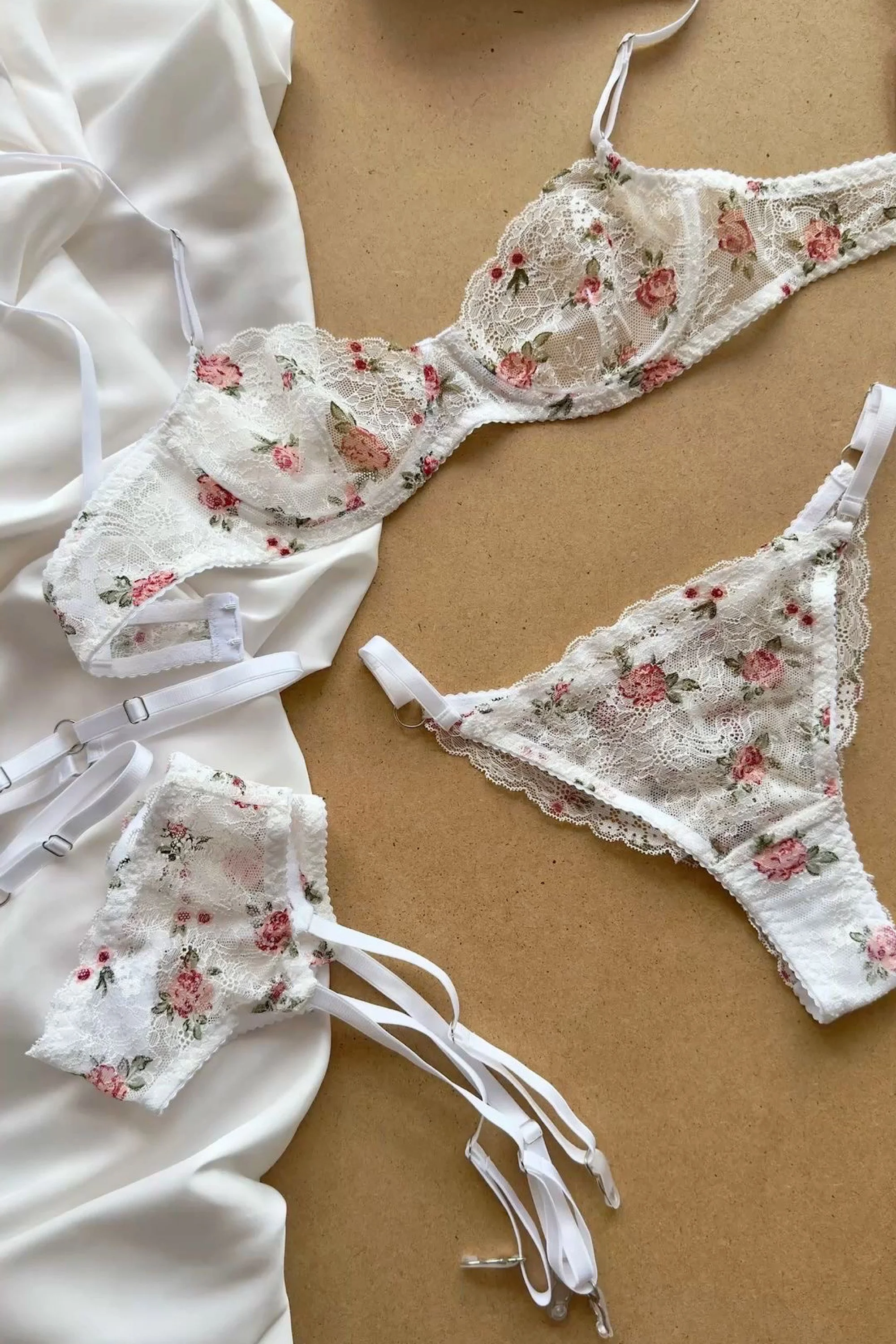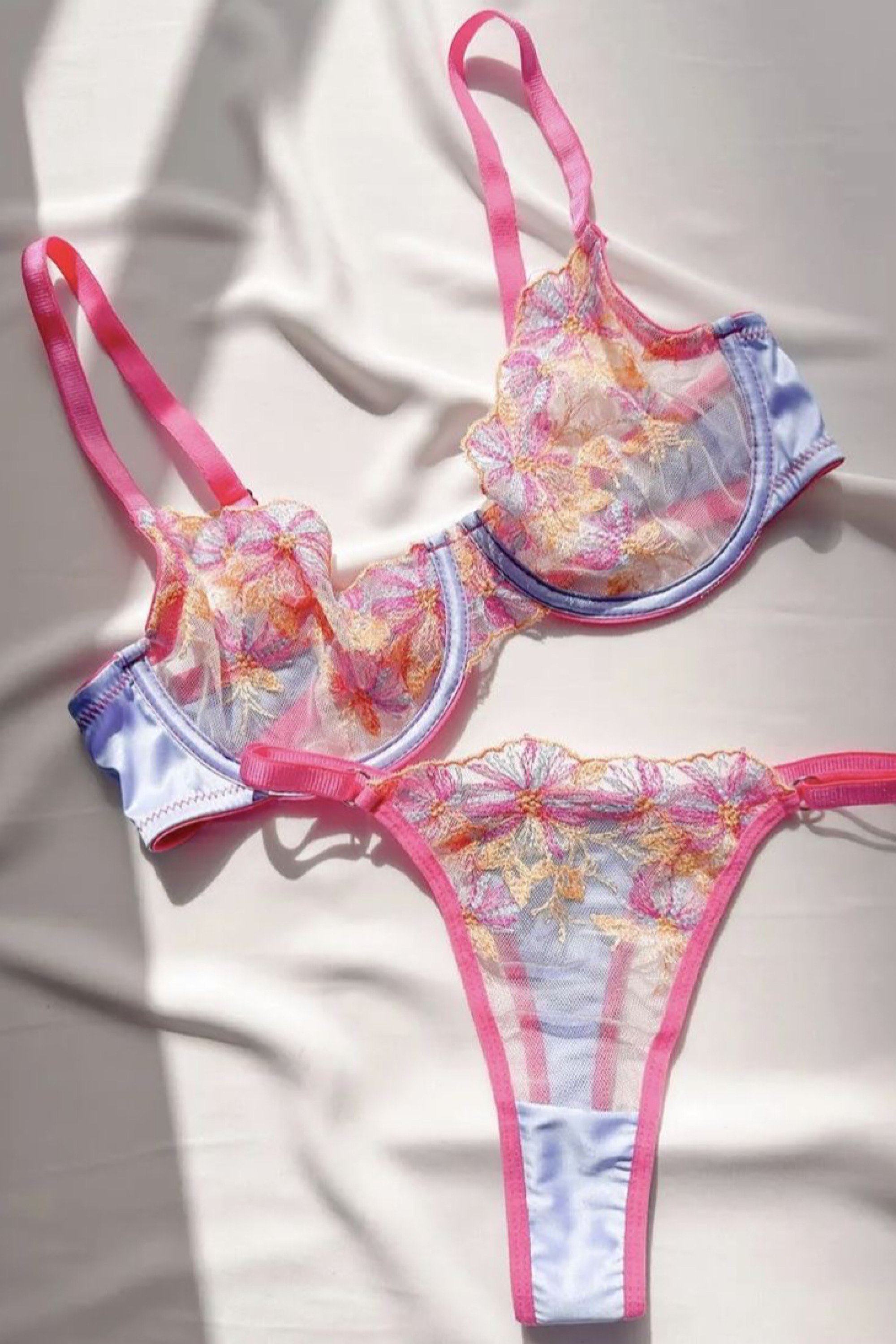 Nude mesh with multicolor floral embroidery is both romantic and commanding. Let the set lead and echo its palette rather than compete. For daytime layering wear a cream knit dress or a pale slip that skims rather than clings and allow a whisper of embroidery to show at the neckline if the moment is private. For evening pair with an ivory silk robe and a soft gold anklet to repeat the warm tones in the stitching. Keep makeup fresh with rosy cheeks and a clear gloss. Hair pulled into a low bun or a loose braid lets the focus remain on the bra and panties. Fragrance with notes of jasmine or vanilla will harmonize with the meadow mood.