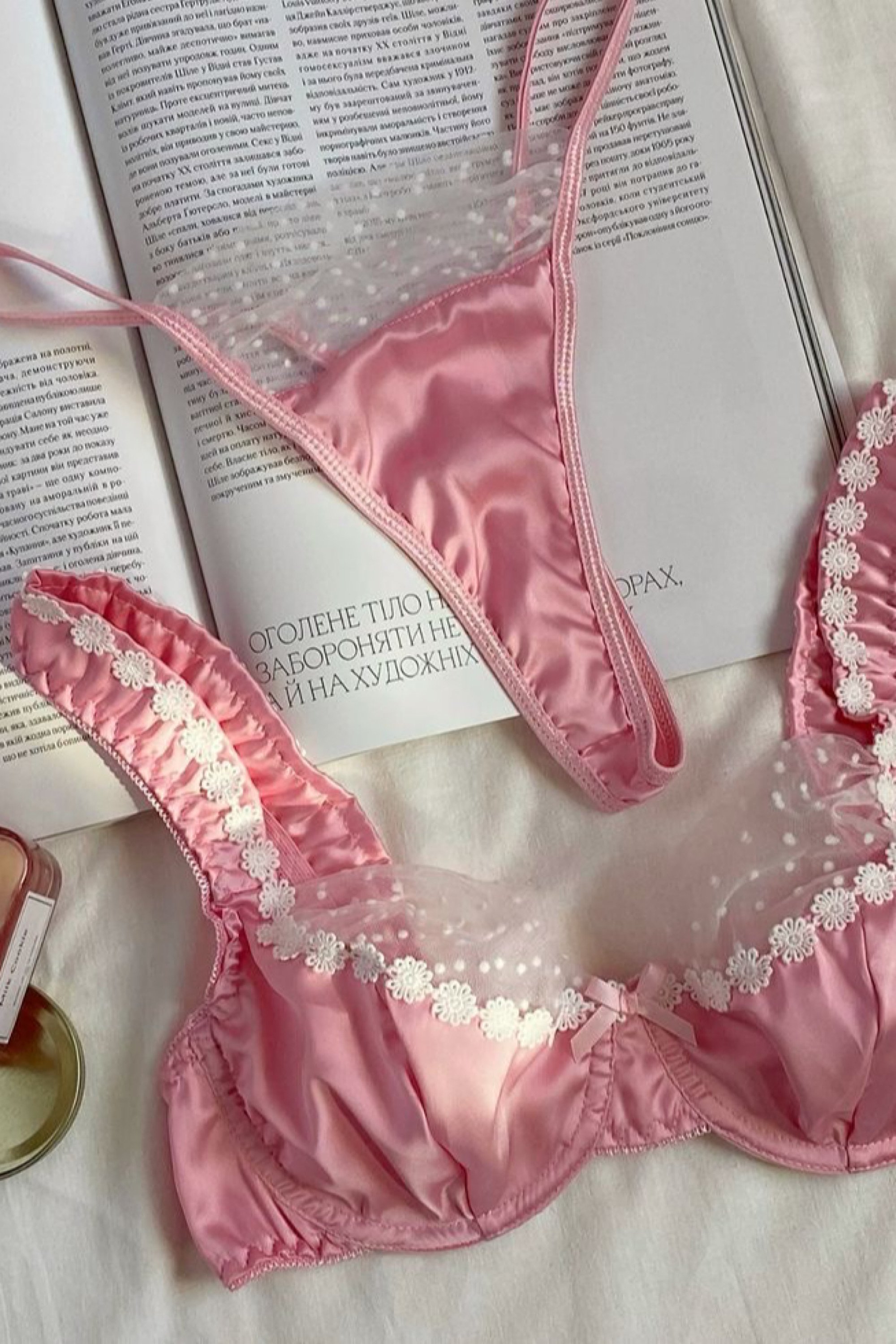 This blush satin and sheer polka-dot set is perfect for mixing innocence with allure. The delicate white floral appliqués create a soft, romantic look that contrasts beautifully with bolder accessories. Pair with a light chiffon robe for a floaty, ethereal mood, or slip on a cropped cashmere cardigan to play up the “good girl” aesthetic before revealing the lingerie underneath.