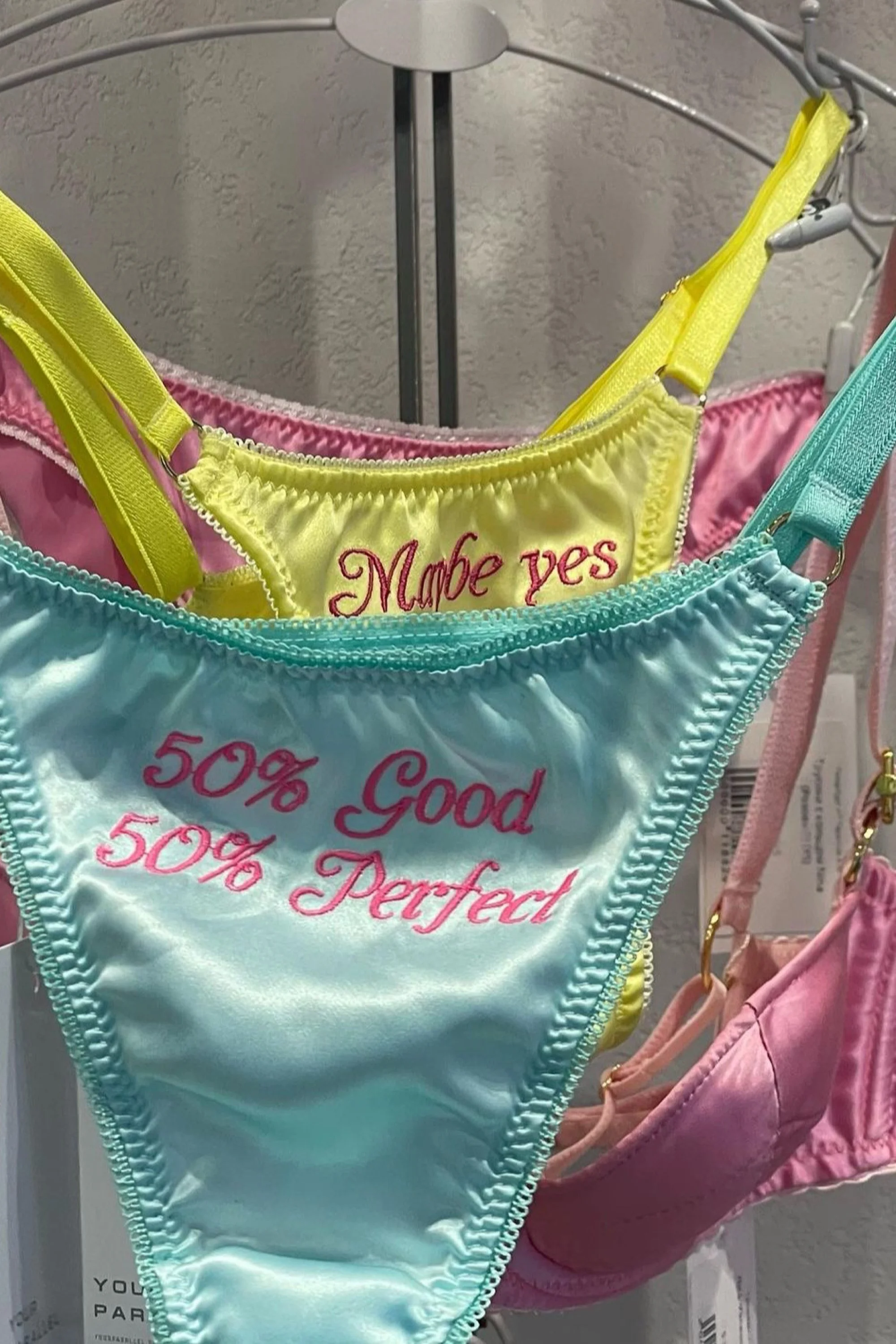 Bold statement lingerie like this turquoise satin thong with pink embroidery works beautifully for playful dominance scenes or as a personal reminder of confidence and control. The vibrant color contrast makes it visually striking, while the cheeky text adds personality. Pair with a matching satin bralette for a coordinated look, or mix with pastel lace for a softer edge. For layering, a sheer mesh slip dress allows the text to tease through without giving everything away.