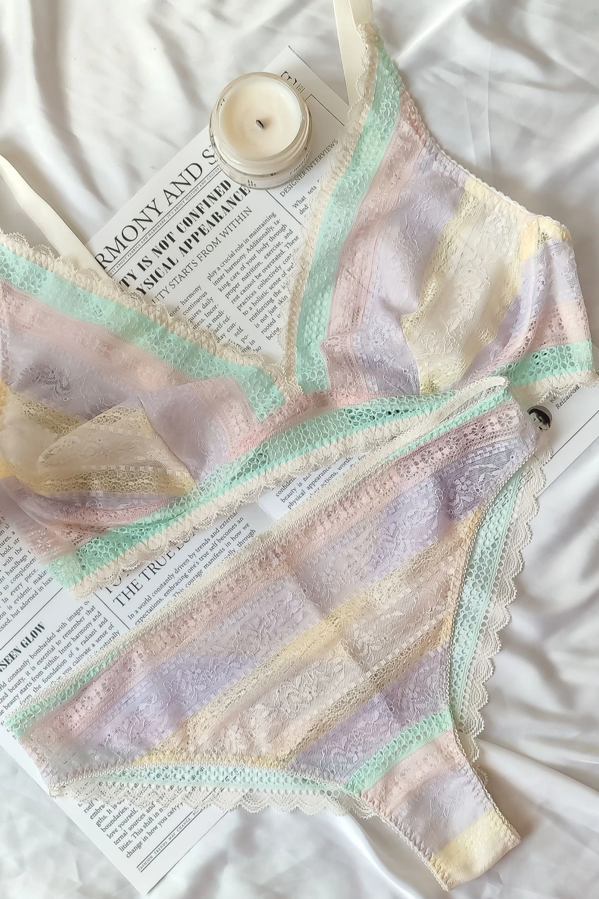 Selene stood in the doorway, wrapped in a quiet kind of light that made the pastel bra and panties seem almost unreal. Bands of mint, lilac, blush, and buttercream lace crossed her skin like ribbons, each color catching Mistress Aria’s gaze and holding it.