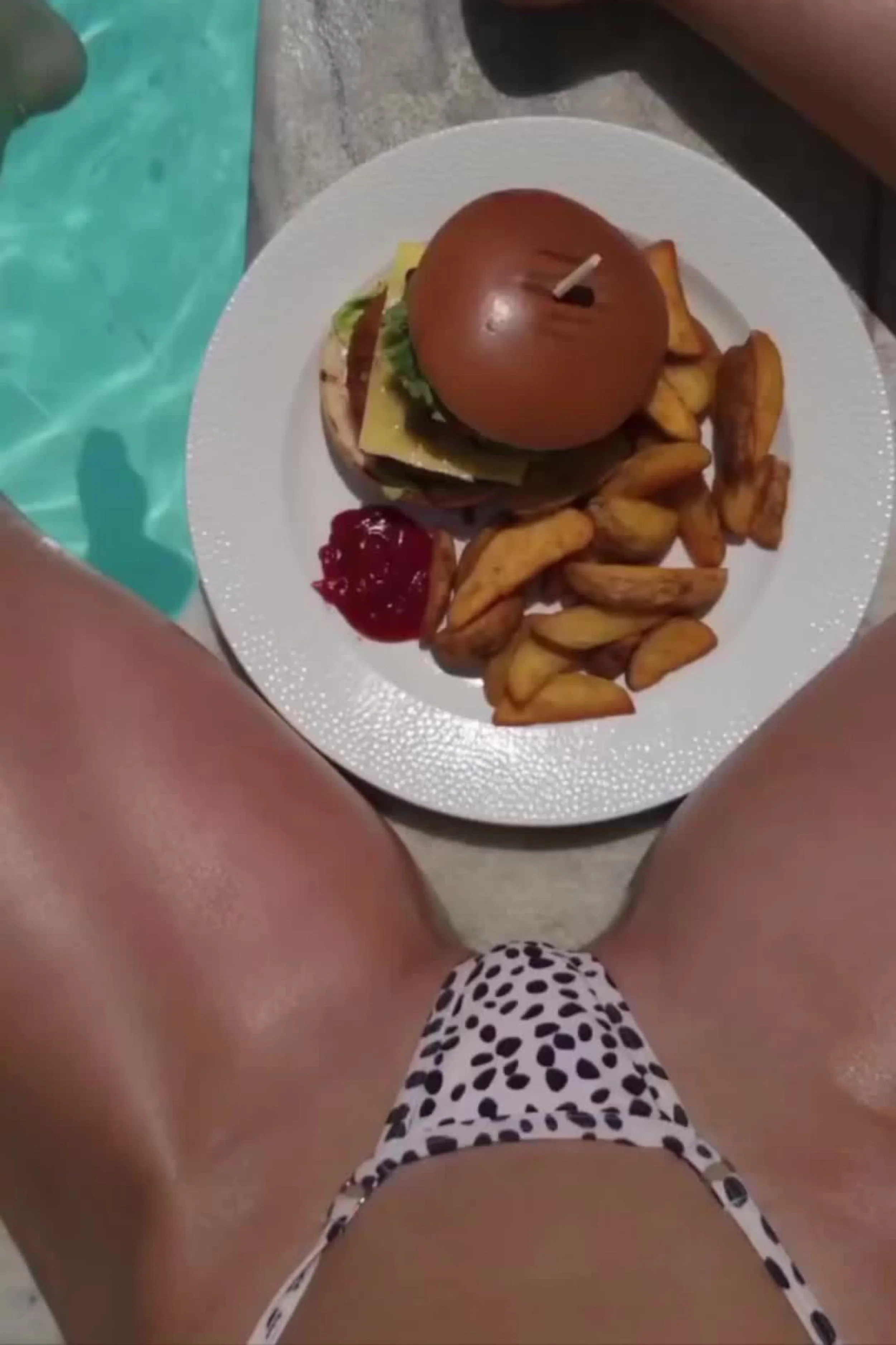 Laid out just inches away is the perfect summer indulgence—a gourmet burger nestled in a glossy brioche bun, layered with fresh lettuce, melted cheese, and a perfectly grilled patty. Crispy potato wedges flank the burger, with a side of ketchup adding a pop of red that mirrors the vibrancy of a perfect beach day. The setting feels decadent and relaxed all at once, blending leisure with style in a way only the best poolside afternoons can achieve.