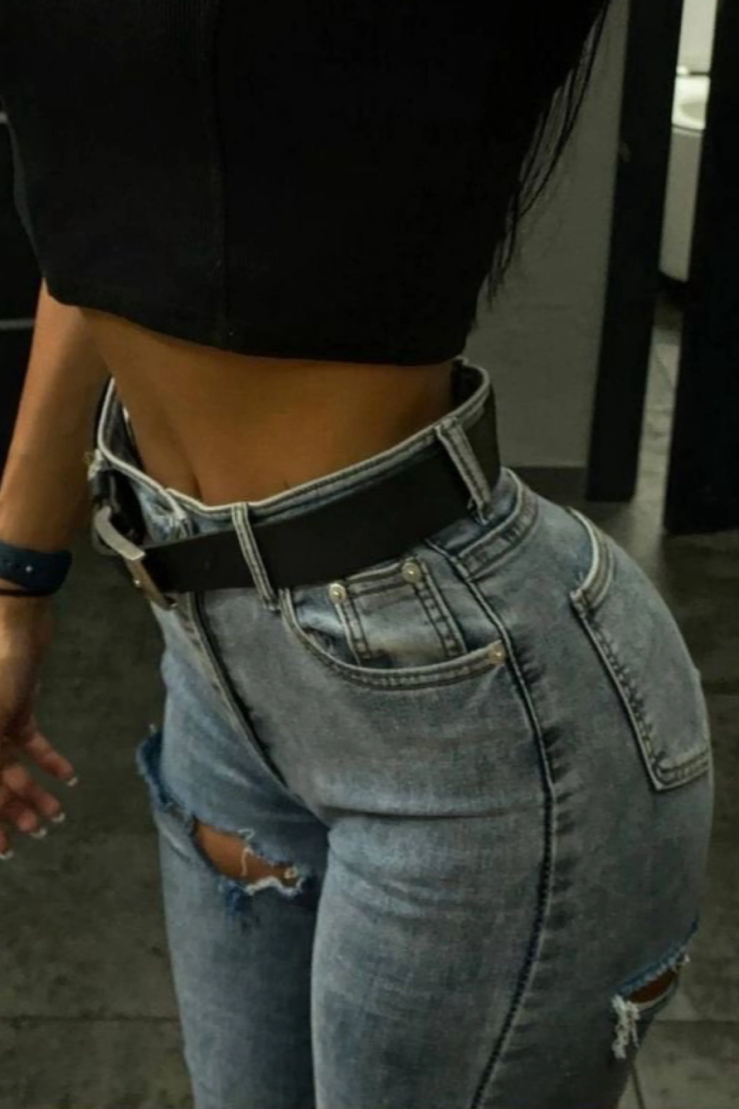 This look leans into edgy street style with distressed mid-wash jeans paired with a cropped black tank. The jeans, ripped at the knees, add a rebellious undertone while the wide belt cinches the waist and brings definition to the silhouette. The cropped tank highlights toned lines, while the dark palette contrasts perfectly against the rugged denim. It is bold yet wearable, evoking a confident energy that feels equally suited for late-night outings or casual music events. The styling suggests attitude and independence, where denim becomes not just casual wear but a statement of individuality.