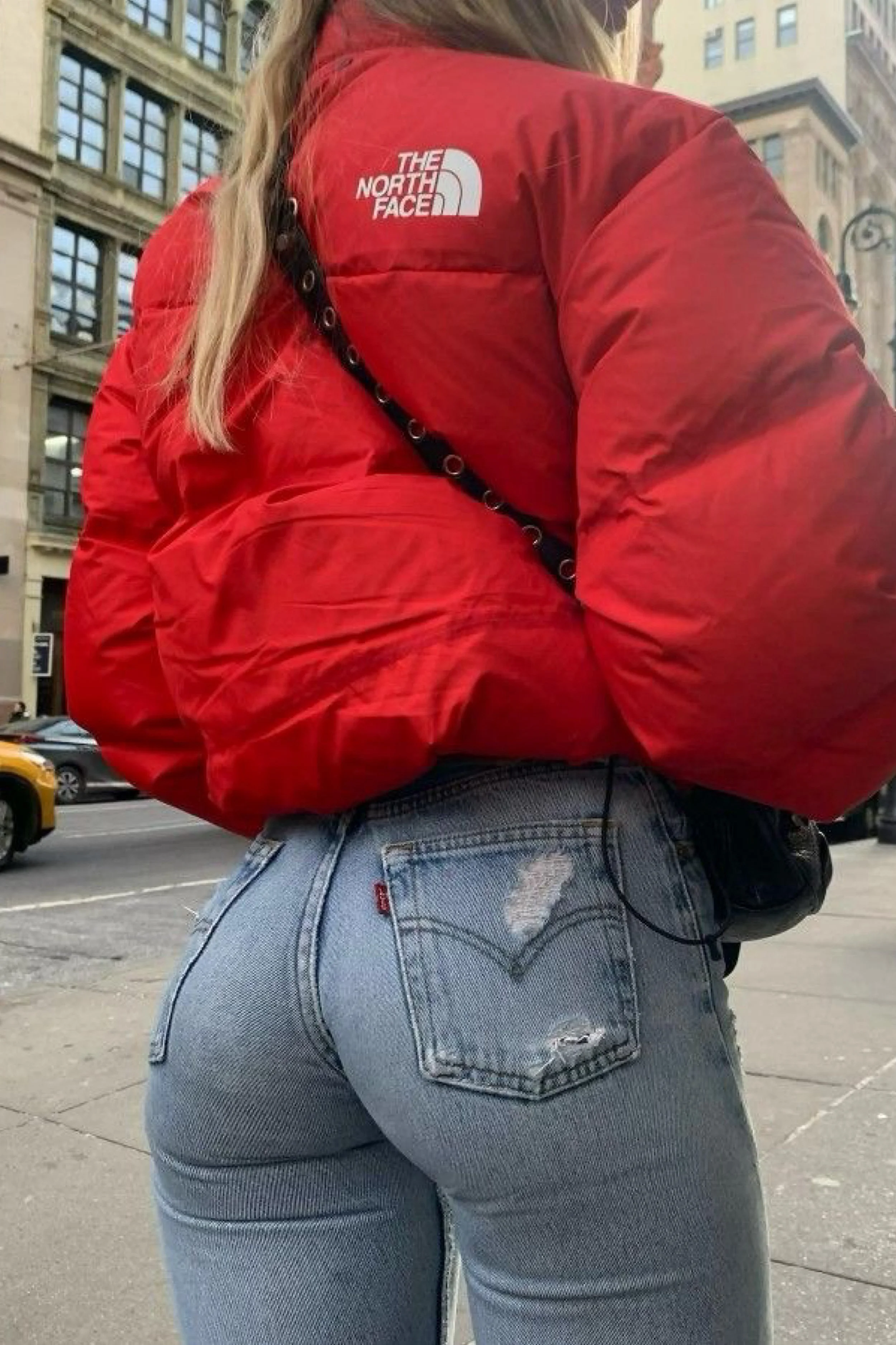 Few looks capture boldness like a bright red puffer jacket thrown over classic denim. This outfit pairs a cropped North Face puffer with distressed Levi’s, keeping the silhouette sleek and urban while adding functional warmth. The light wash denim grounds the fiery red, creating a strong color story that feels modern and energetic. The crossbody bag slung casually and the loose hair bring in easygoing touches. The distressed jeans ensure the look stays casual-cool, not overly polished. This outfit screams city-ready—perfect for running errands downtown, meeting friends, or braving cold weather in style.