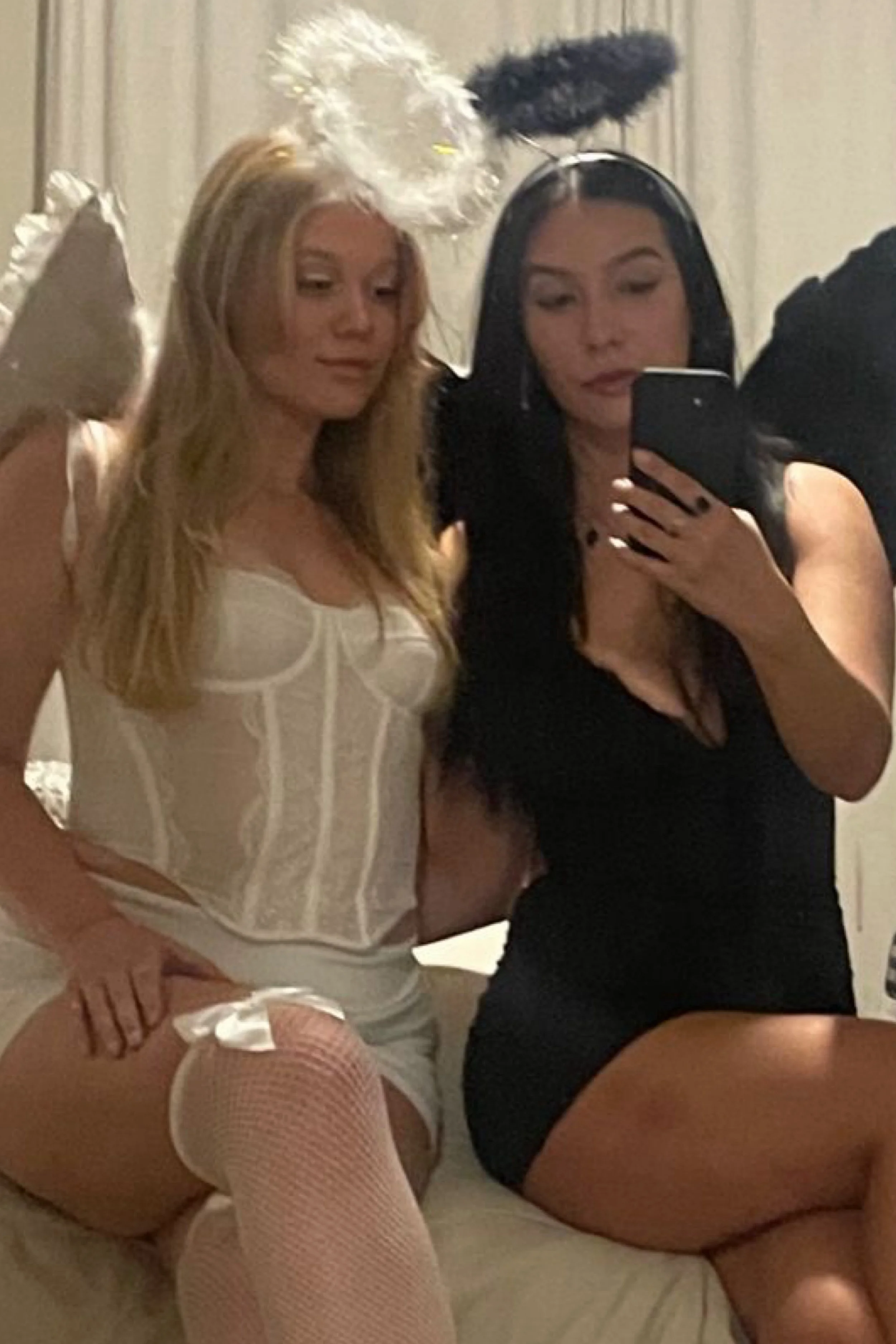 This duo spins the angel costume into something more sensual and nightlife-ready. One wears a white corset and matching stockings with feathery wings and a halo, while the other rocks black lingerie with dark angel wings and a shadowy halo. The contrast between light and dark creates a provocative pairing — angelic allure against wicked temptation. The look is feminine, bold, and made for an after-dark party setting.