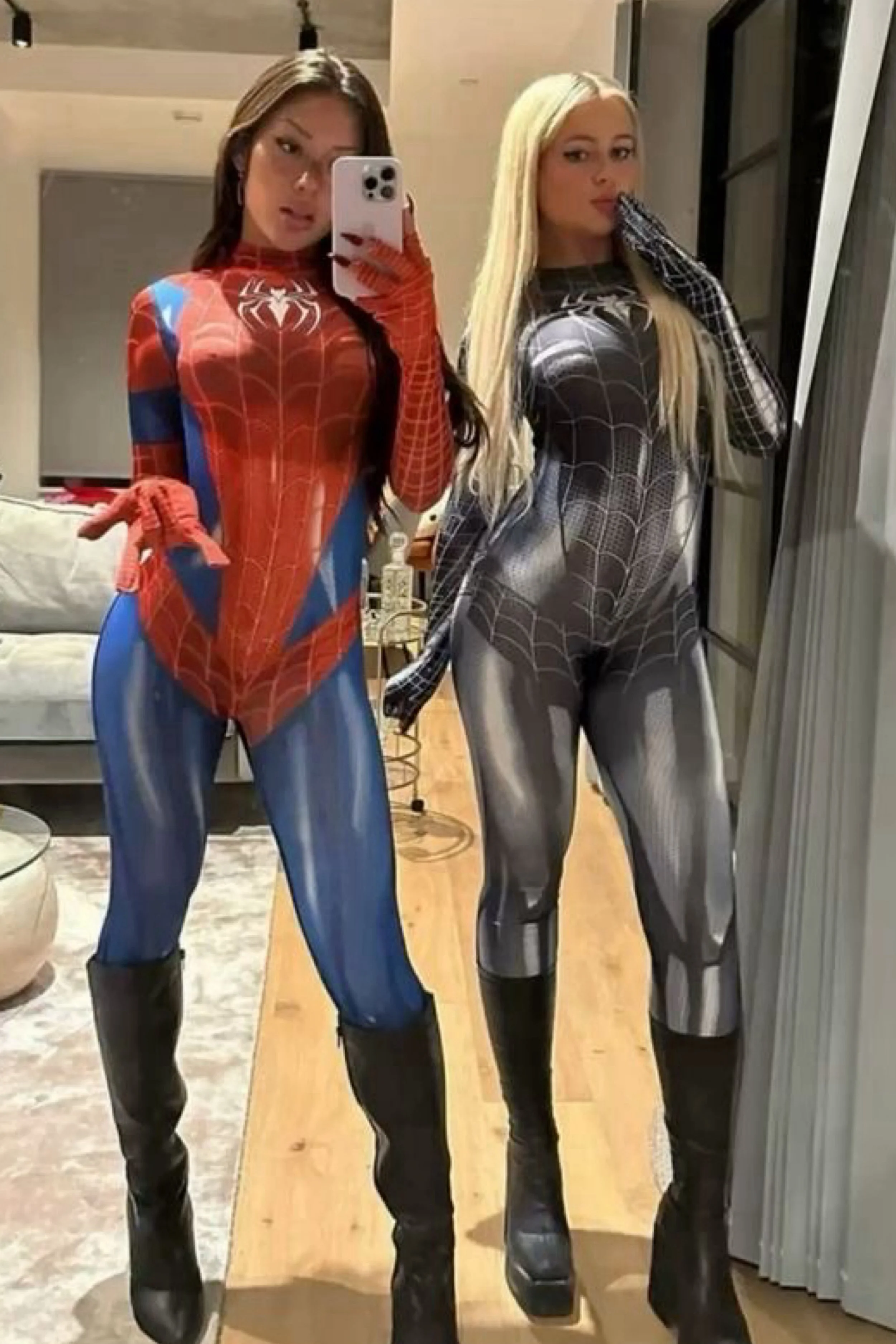 This duo takes superhero inspiration and transforms it into sultry Halloween glamour. One wears the classic red-and-blue Spider suit, the other dons a sleek black symbiote-inspired version. Both are fitted bodysuits that sculpt the silhouette, paired with black boots to elongate the legs. The overall effect is chic, powerful, and seductive — equal parts comic book and nightclub-ready.