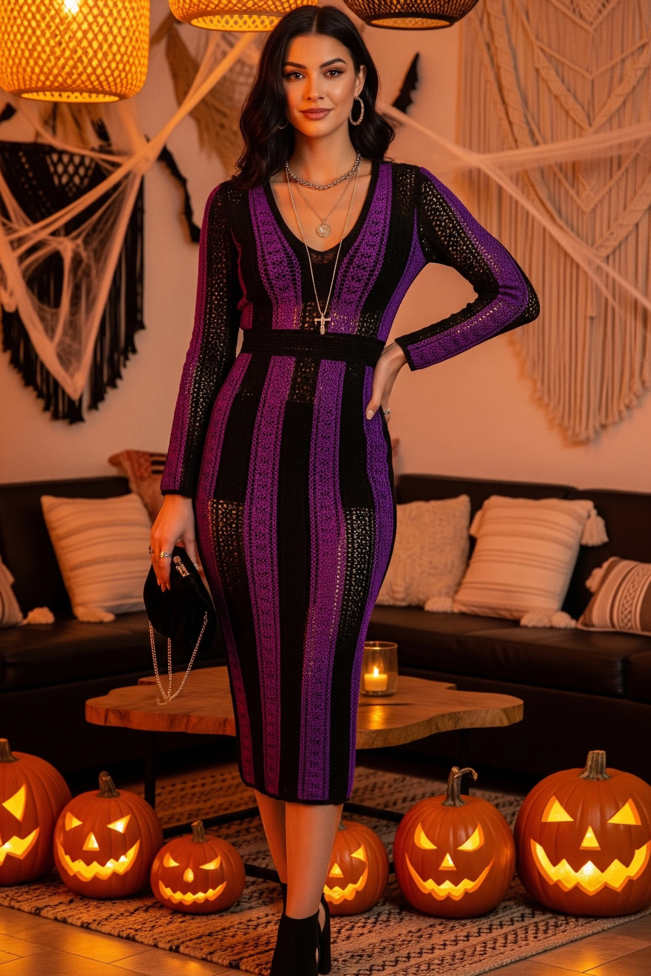 This gothic-inspired crochet dress makes a bold entrance with its vivid vertical stripes in black and royal purple. The midi-length bodycon fit elongates the frame while the crochet’s texture provides visual intrigue. A plunging neckline adds sultry appeal, while long sleeves balance it out with elegance. The combination of deep black and vibrant purple captures the mood of Halloween while still feeling wearable beyond costume parties. This design is equally perfect for themed events, moody dinners, or cocktail evenings with a gothic twist. Crochet detailing softens the bold color blocking, giving it an artisanal, luxe finish. It’s a striking choice that exudes confidence and charisma—ideal for those who love fashion that celebrates drama, edge, and artistry in equal measure.