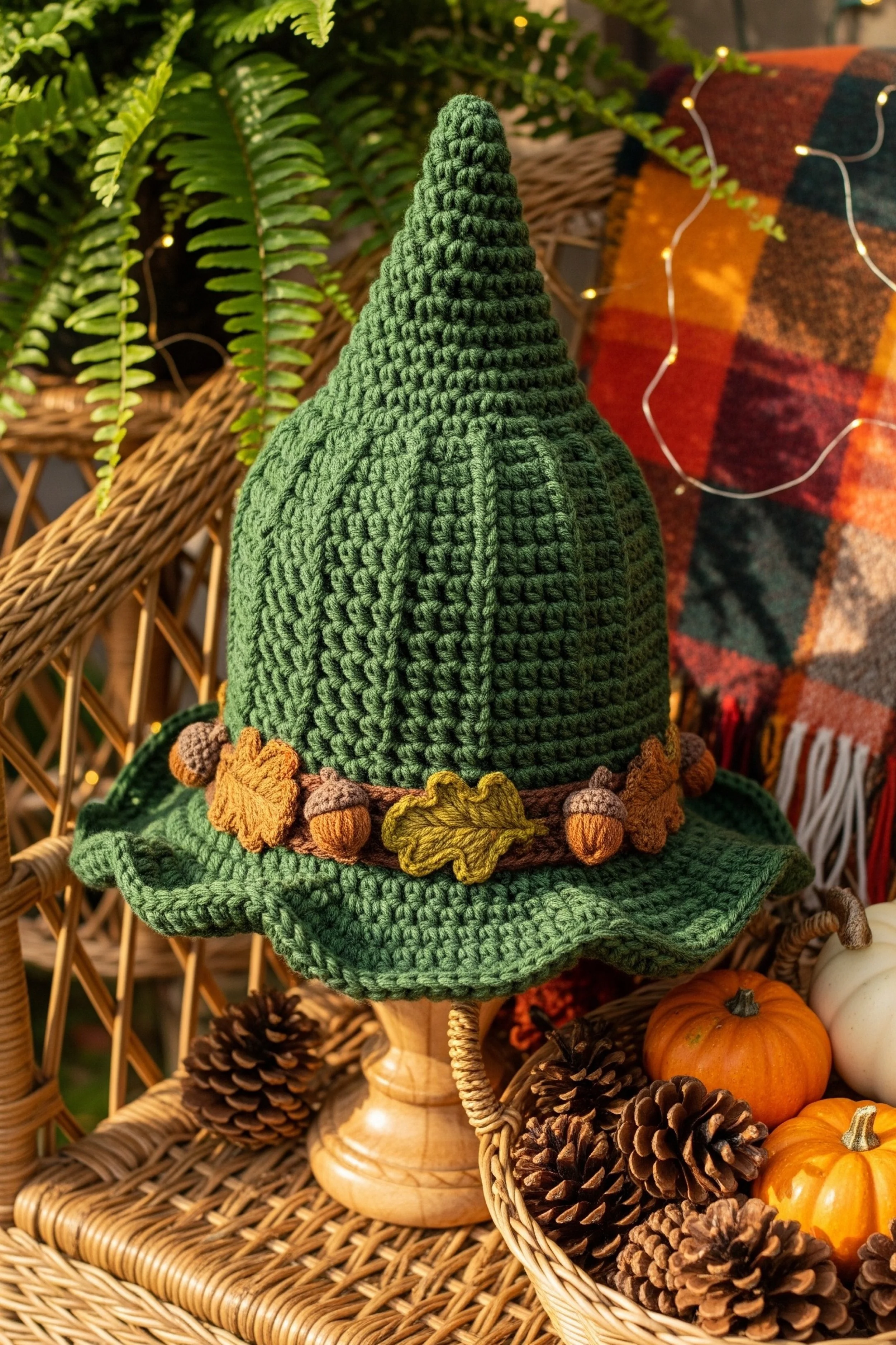 This hat pairs beautifully with rustic, natural-inspired outfits. Try it with a cream knit sweater, corduroy overalls, and lace-up boots for a cozy woodland look. For a more witchy ensemble, pair it with a forest green maxi dress, layered with a brown leather belt and earthy jewelry like stone pendants or wooden bangles. The leaf and acorn accents make it perfect for styling with autumn accessories: plaid scarves, wool cloaks, or knit cardigans in mustard or rust tones. Makeup can stay soft and natural — golden eyeshadow, a hint of bronzer, and nude lips — or lean into earthy drama with deep green eyeliner. Whether you’re at a fall festival, pumpkin patch, or a cozy cabin gathering, this hat makes you look like the guardian of autumn itself.