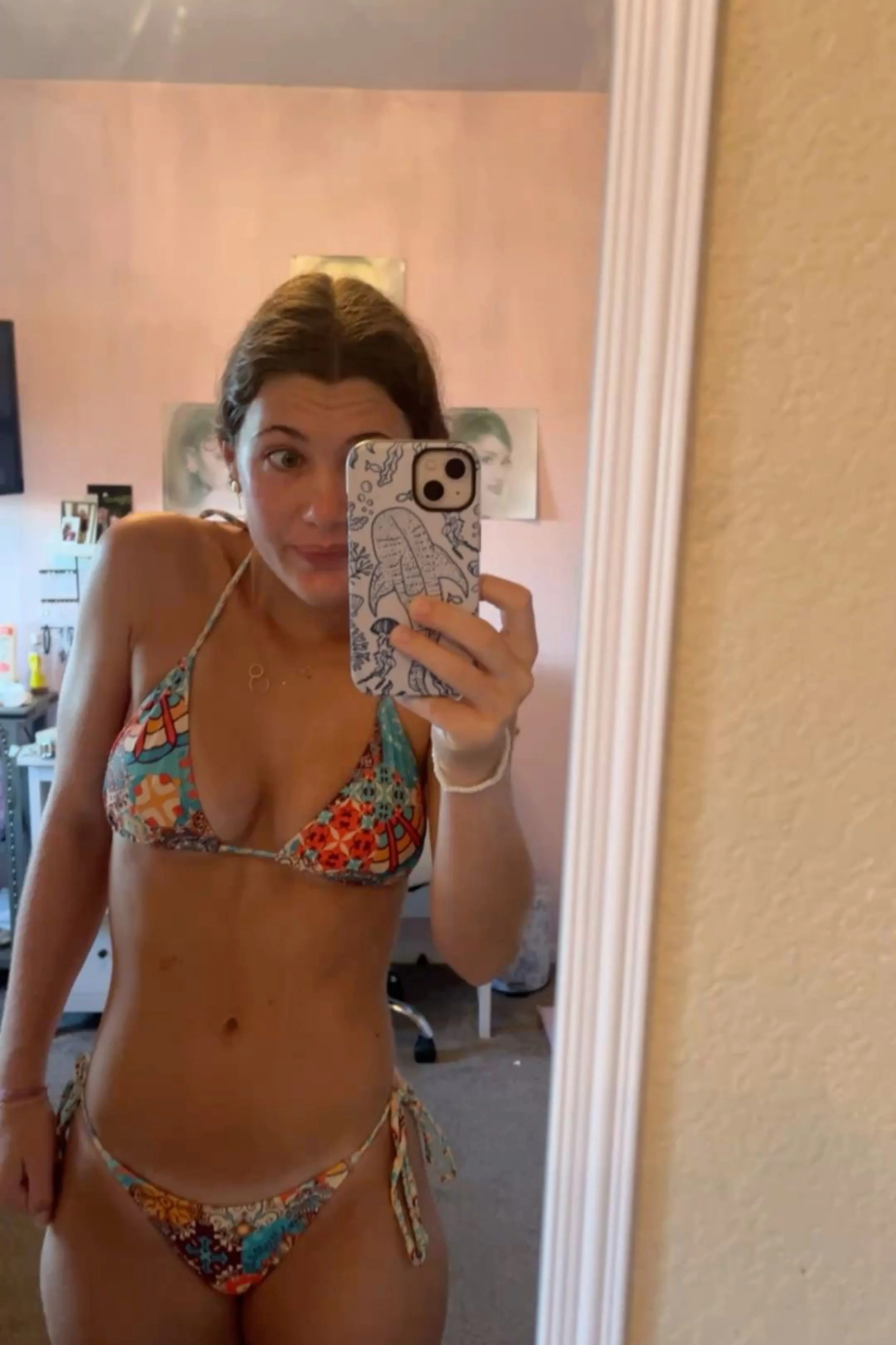This bikini feels like a little postcard collage you can wear. The print mixes sun warmed oranges, soft blues, and creamy neutrals in a patchwork style that reads artsy instead of busy. The triangle top keeps the shape classic and beach ready, while the thin straps and tie side bottoms give you that adjustable fit that always feels personal and easy. What makes this set pop is how the pattern behaves in real light. It catches highlights, photographs well indoors and outdoors, and looks especially good against simple backdrops like white walls, light wood, or clean linen textures. The color story also makes it versatile. It can lean boho with woven accessories, or feel more modern when paired with crisp basics. This is the kind of bikini that looks collected rather than random, like something picked up on a trip and worn all season because it never feels boring. It gives playful energy without needing loud colors, and the print does the styling work for you.