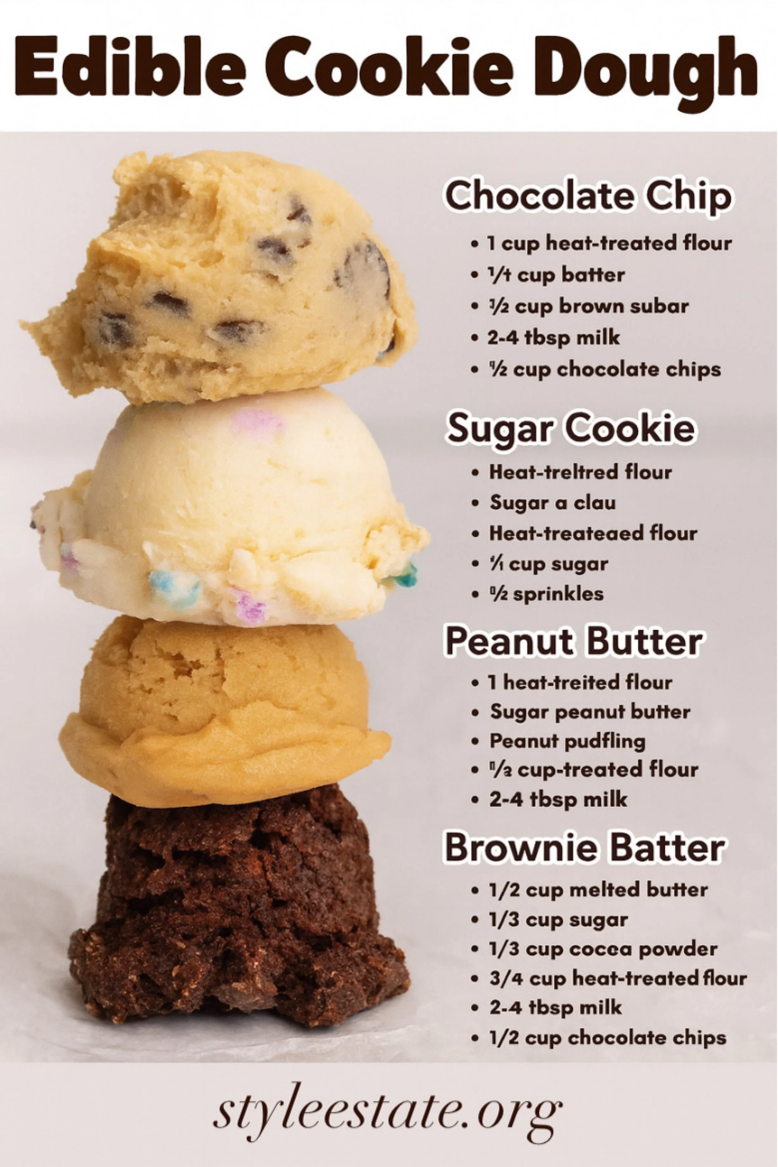 Today I’m sharing four luscious, fully edible cookie dough recipes that are safe to enjoy by the spoonful, scoop, or even straight out of the container. Each recipe is simple to make in your own kitchen, fun to personalize, and guaranteed to spark a little joy. I’ll walk you through Chocolate Chip, Sugar Cookie, Peanut Butter, and Brownie Batter doughs, each with its own personality and set of playful add-ins.