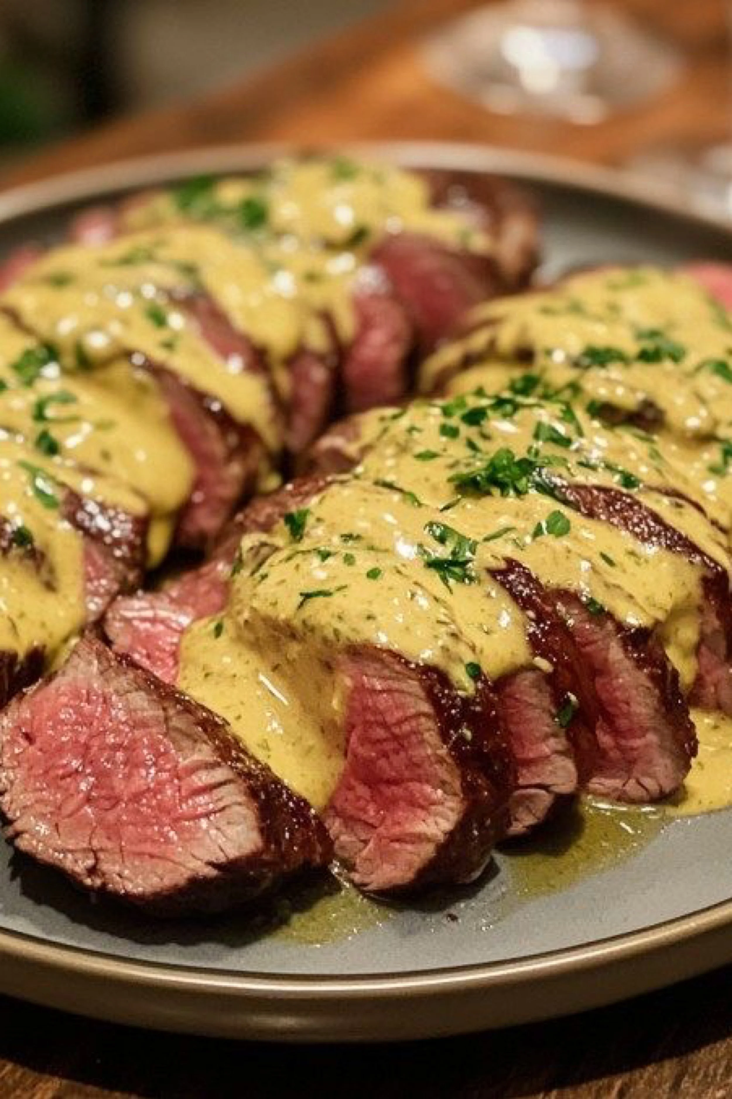 This is the kind of meal that turns an ordinary evening into an occasion without announcing itself. It’s not loud. It doesn’t need a crowd. It’s a small ceremony of heat and timing—of trusting a pan to do what it does best, of letting butter brown just enough, of watching cream thicken into velvet, of letting mustard bring a clean, bright bite that wakes up everything else. A steak can be many things—weeknight fuel, weekend reward, summer grill ritual—but here it becomes something more intimate. It’s carved after a rest, when the juices have settled and the knife glides through with that faint resistance that signals tenderness. The slices spread like pages, and the sauce becomes the punctuation: tangy, rich, and lightly herbal, with the kind of warmth that lingers.