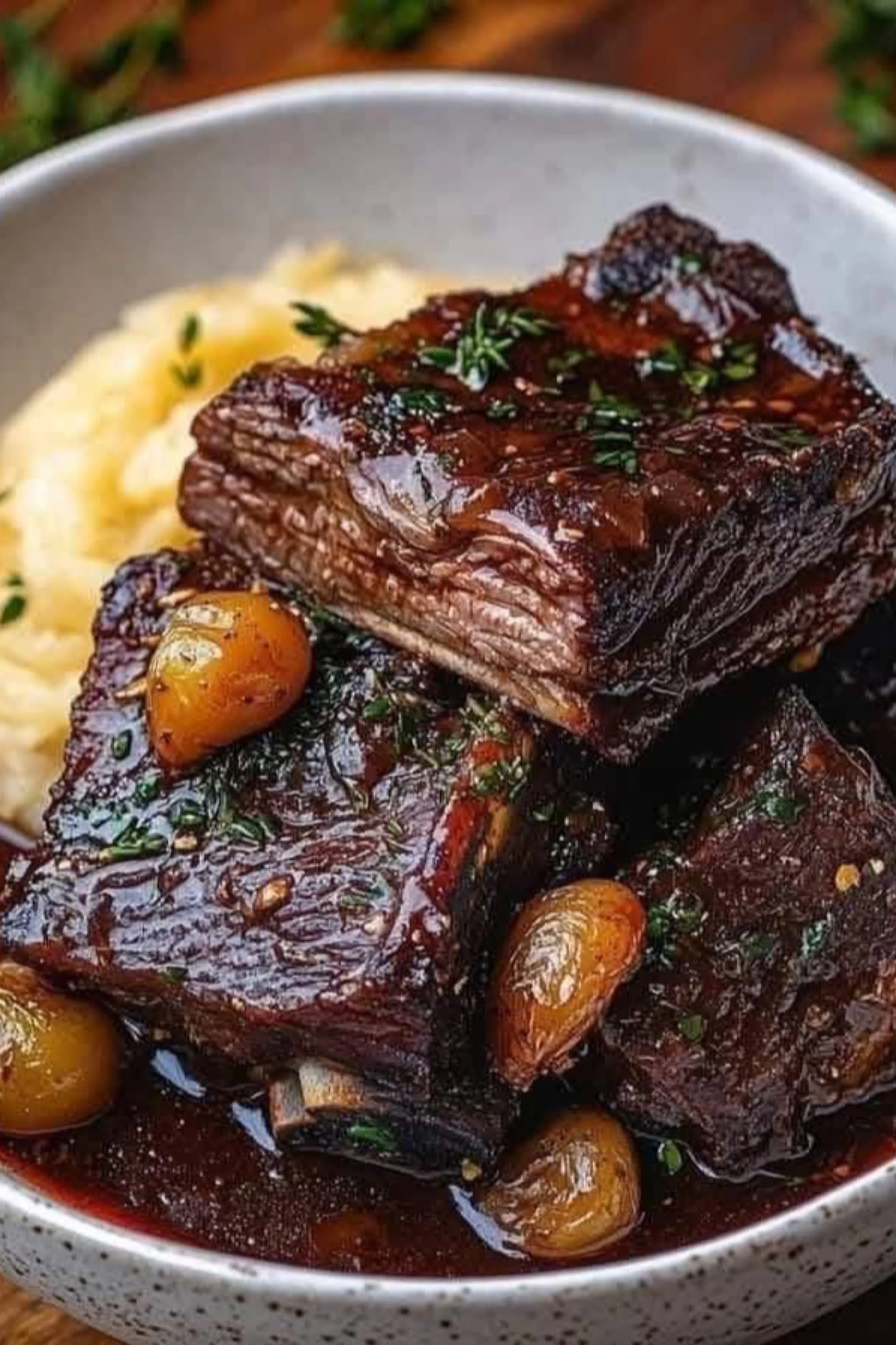 Short ribs have a way of turning time into flavor. They start out stubborn—thick with connective tissue, built for slow work—and then, with enough heat and moisture, they surrender into something luxurious. That transformation is what makes this dish feel a little cinematic. The sauce becomes a concentrated memory of everything that happened in the pot: browned edges, softened aromatics, wine’s fruit and bite mellowed into something round, stock reduced into body, herbs turned from sharp to earthy. You don’t just taste beef; you taste the hours it took to become tender.