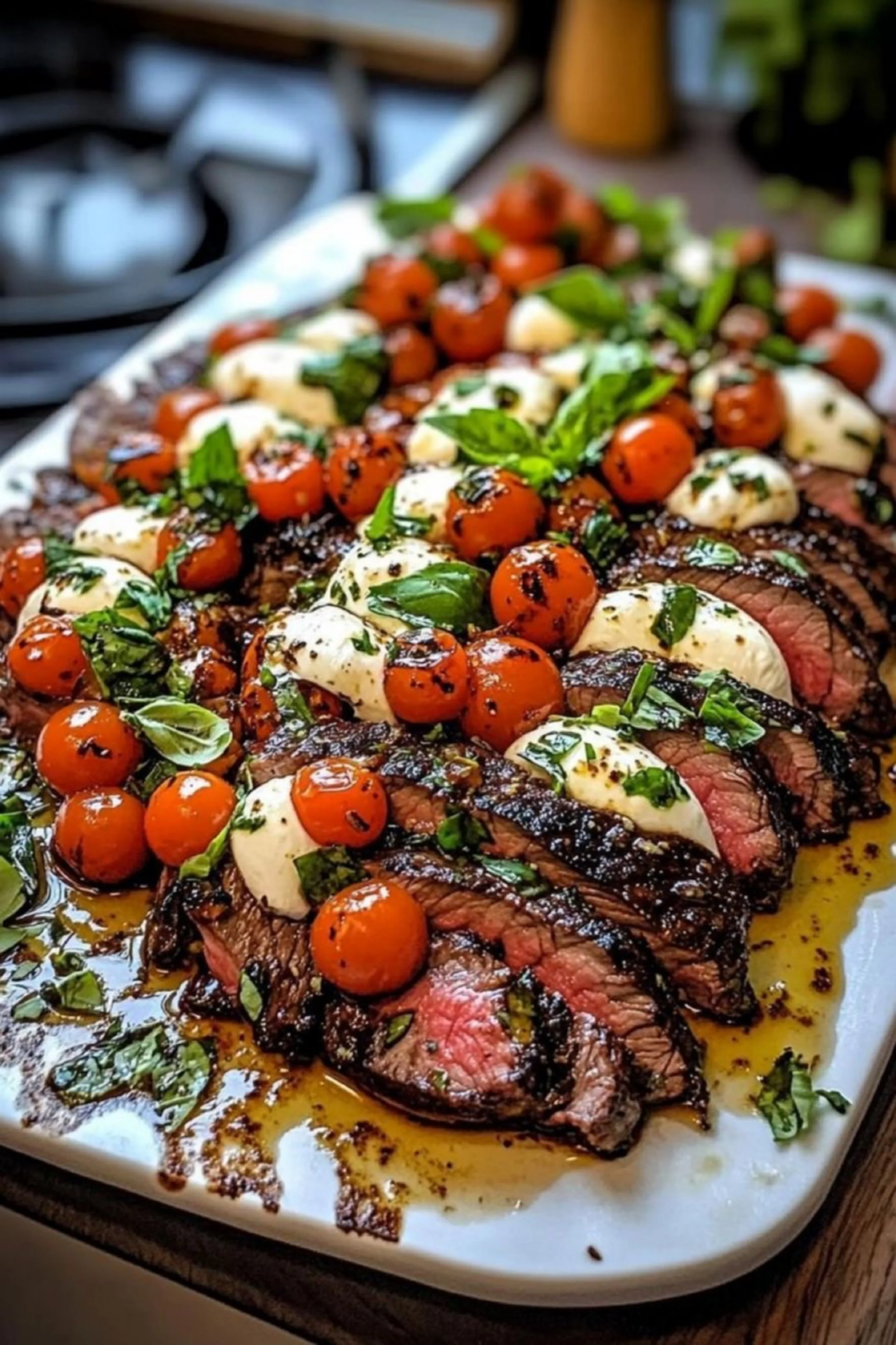 The first thing you notice is the shine—golden, buttery drips pooling at the edge of a white platter, catching the light like it’s late afternoon and the kitchen has gone quiet on purpose. Slices of steak fan out in a dark, confident arc, their seared edges nearly blackened in the best way, the center blushing warm and tender as if it’s still holding onto the heat from the pan. Across the top, cherry tomatoes sit glossy and barely blistered, some with that split skin that tells you they met high heat and didn’t flinch. Between them, soft rounds of mozzarella nestle like little clouds, the kind that go creamy at the edges when the plate is still warm. Fresh basil—torn, not chopped—scatters over everything with that unmistakable green perfume that makes the whole scene feel like summer even if it’s raining outside.