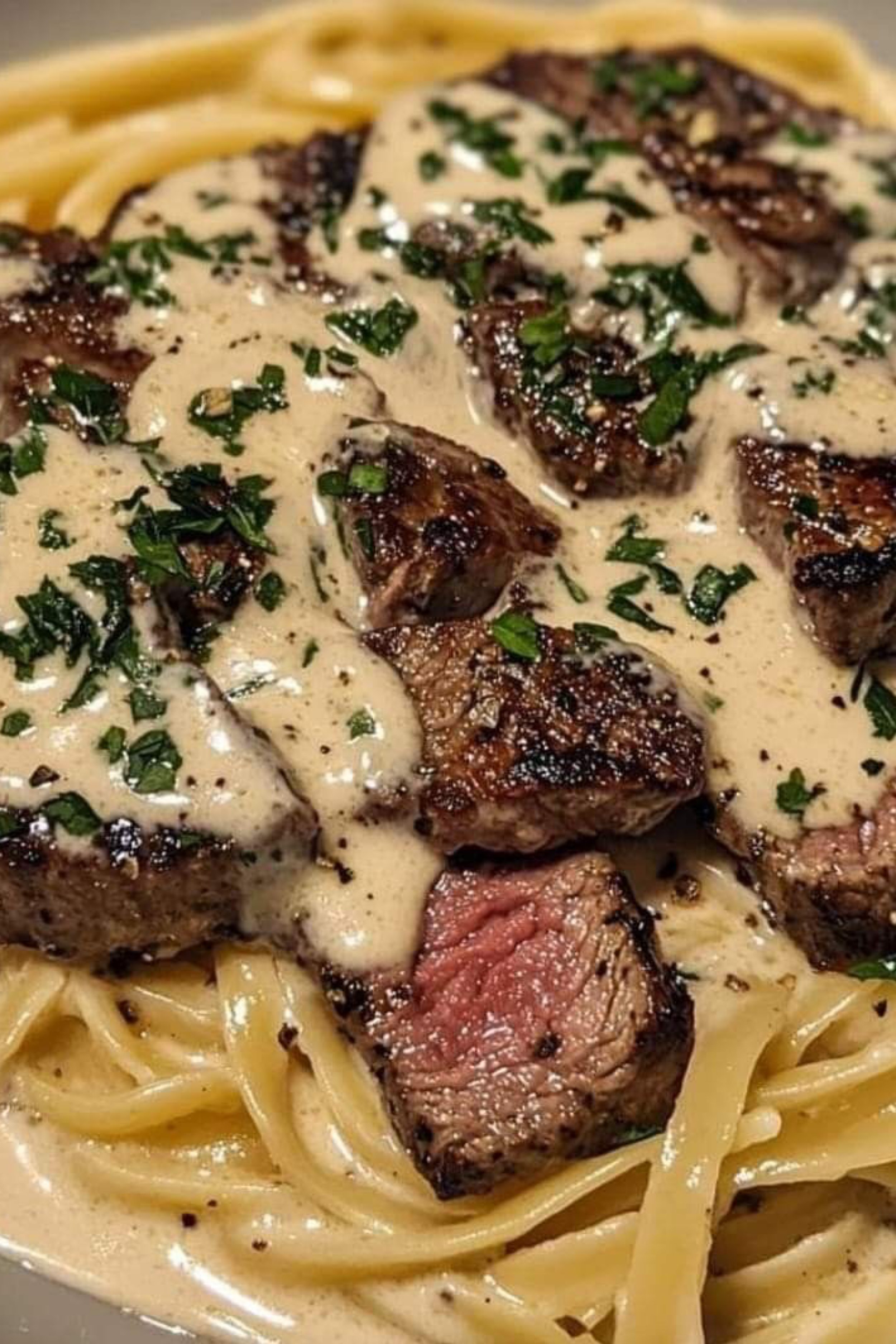 The first thing you notice is the sheen—silk-thick and pale, pooling in slow waves over the pasta like warm satin. Cream clings to each ribbon of linguine, turning the strands glossy and sunlit, the kind of finish that makes a simple bowl feel like a private indulgence. Then your eyes land on the steak: seared cubes with edges darkened to a near lacquer, crusted in pepper and salt, their surfaces catching the light in tiny sparks of caramelization. A scatter of chopped parsley snaps everything into focus—green flecks that look like fresh air against all that richness.
