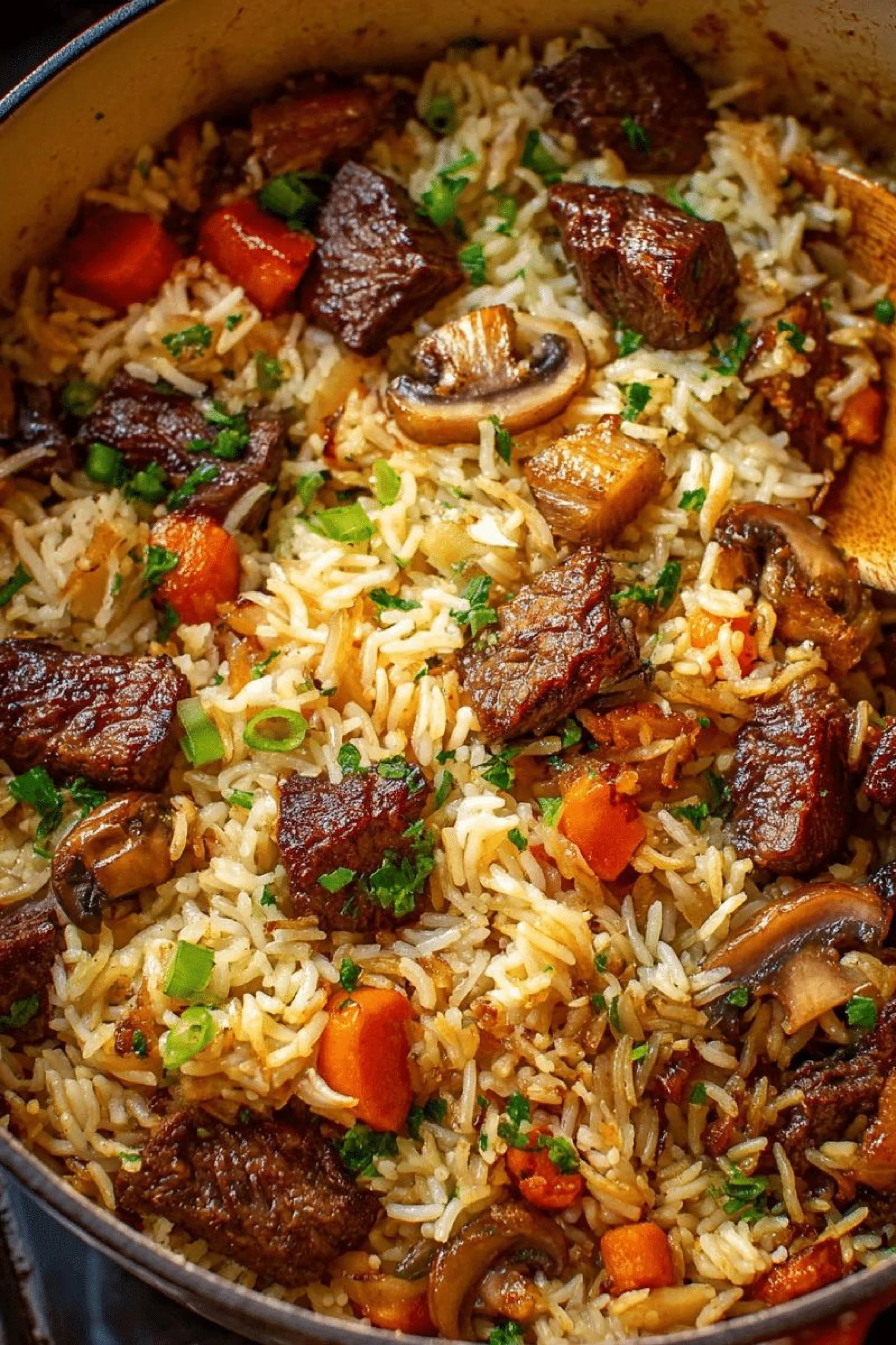 The lid lifts with a quiet sigh, and the kitchen instantly feels warmer—like the room just remembered it’s allowed to be cozy. Steam rolls up in soft waves, carrying that unmistakable perfume of browned beef, toasted rice, and the deep, woodsy sweetness of mushrooms that have given up their edges and gone silky. The surface is a mosaic: glossy cubes of beef tucked between long grains of rice, carrots softened into orange jewels, mushrooms peeking through like little crescents of bronze, and a scatter of bright green herbs that makes the whole pot look alive.