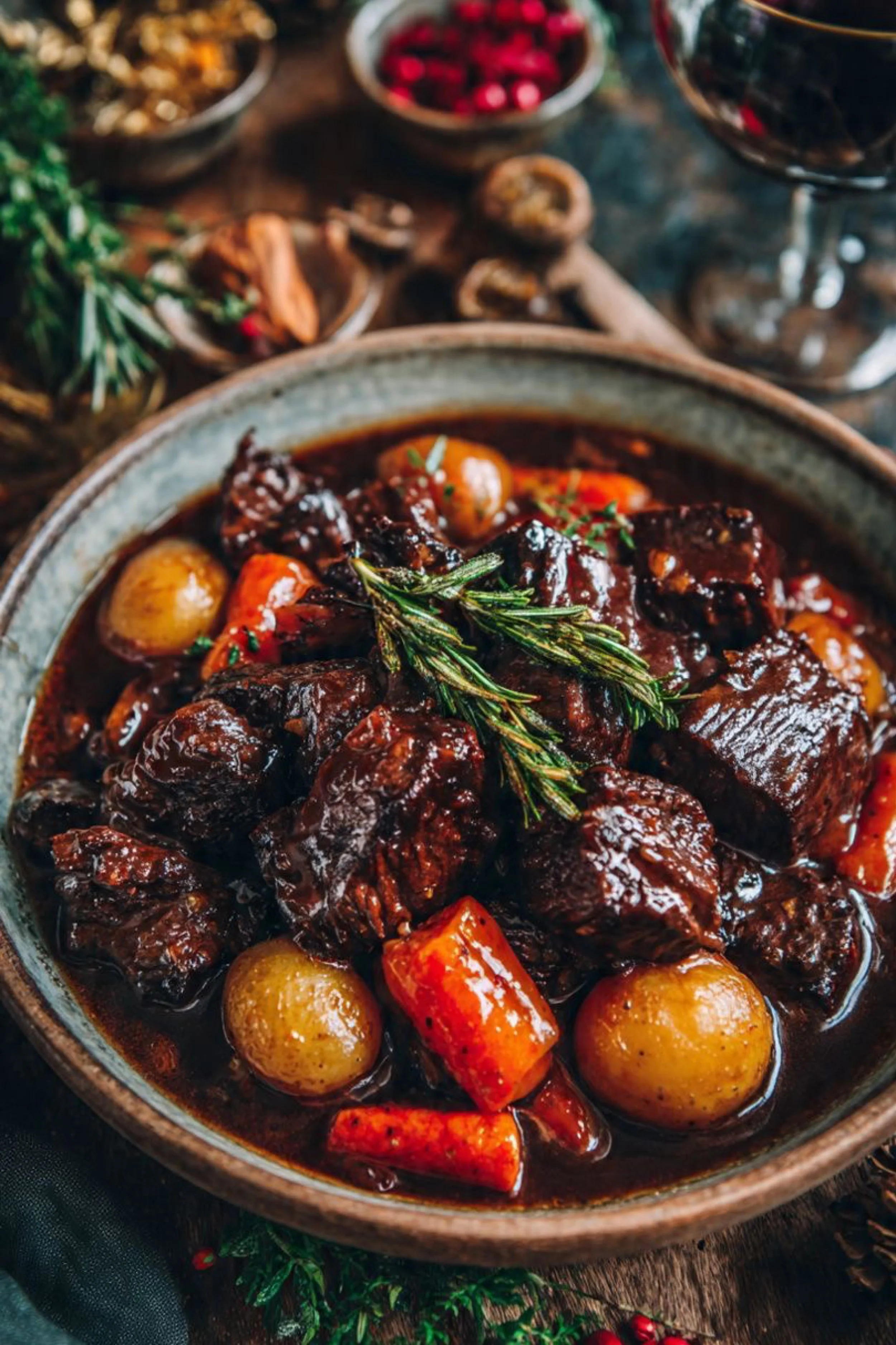 This version leans into the visual drama you see in the bowl: a dark, reduced red-wine sauce; baby potatoes that stay intact; chunky carrots that hold their sweetness; and rosemary that perfumes the whole thing like a forest breeze sneaking into a warm room. It’s luxurious in the way only comfort food can be—honest, rich, and completely unbothered by trends.